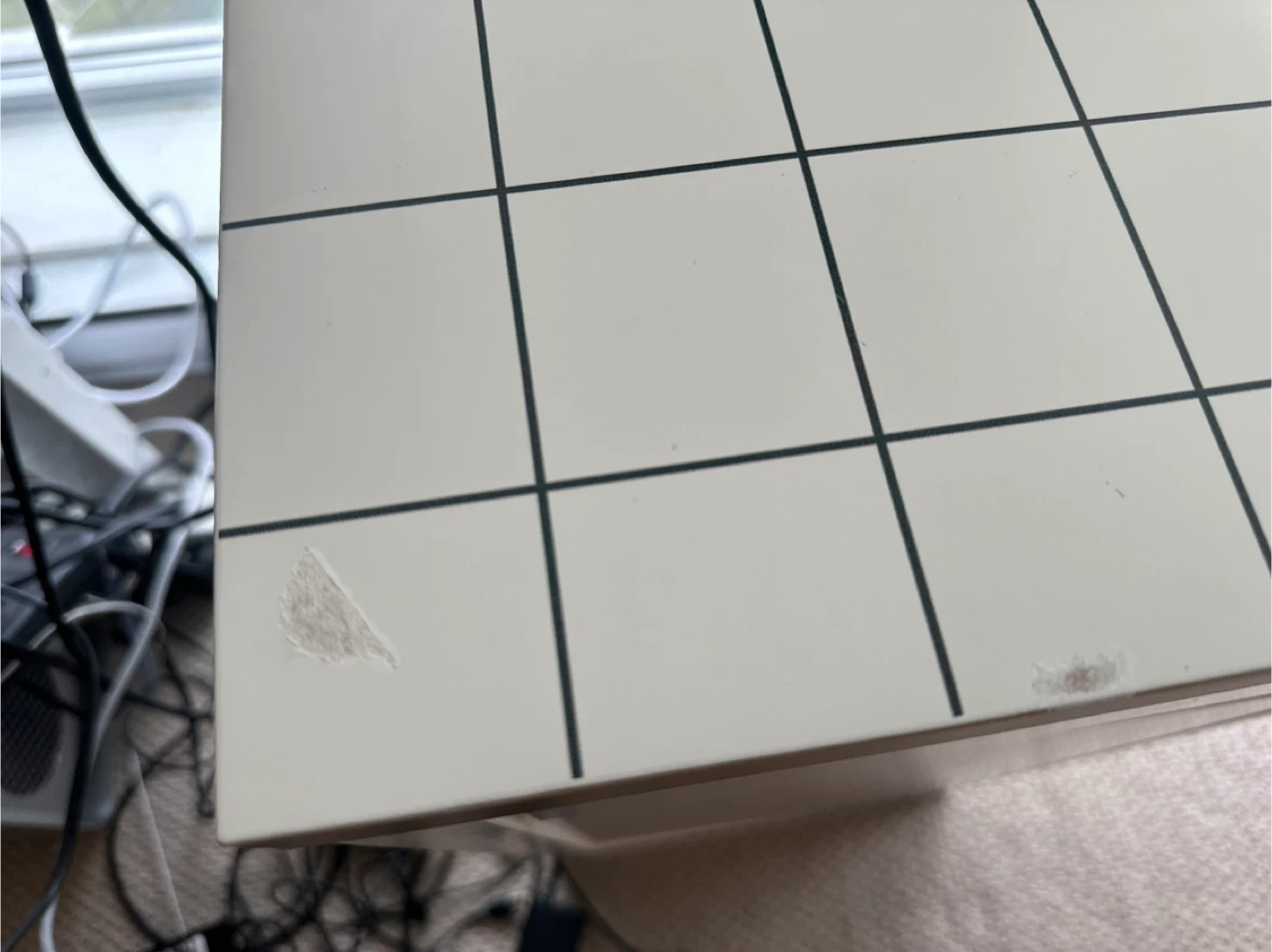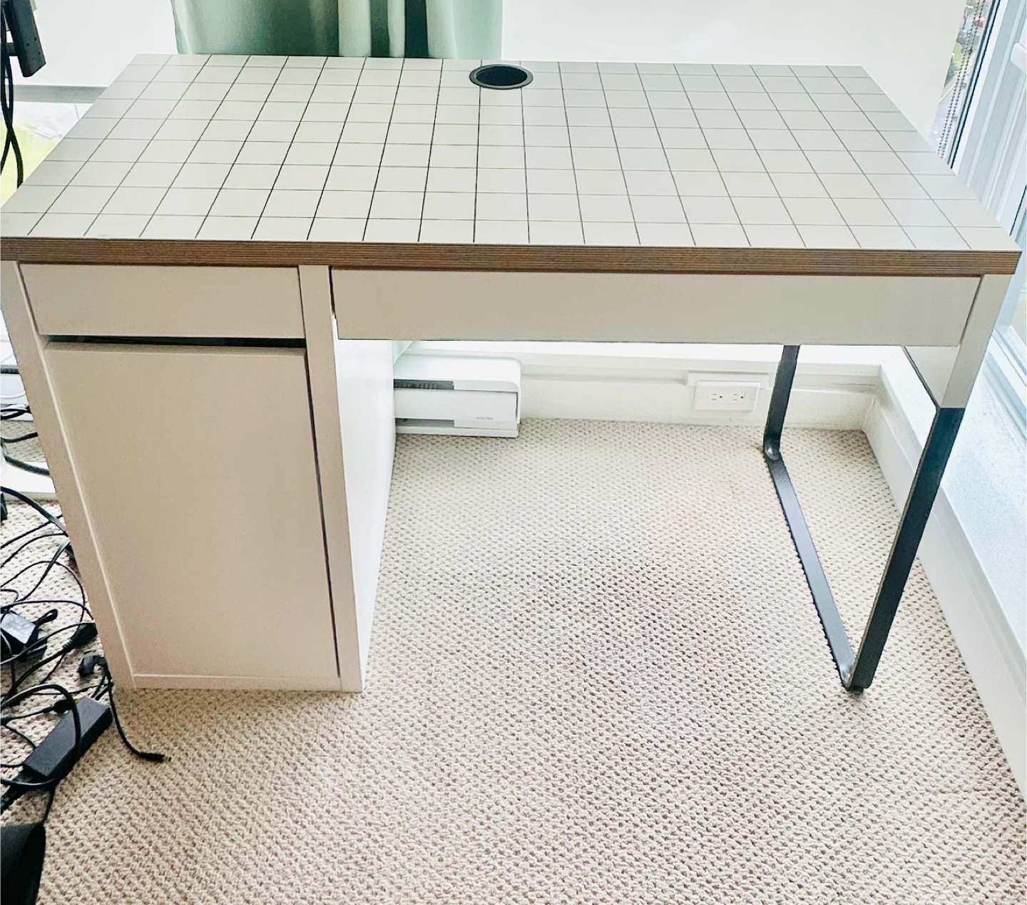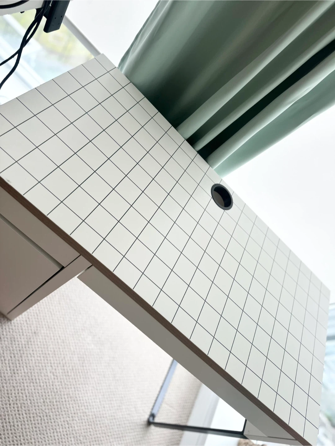 Versatile IKEA desk. Has a cool grid pattern top, great for games like checkers or even as a craft table. Built-in storage cabinet with shelves and a drawer. Also has a cable management hole to keep things tidy. Super useful for a bedroom or office space.