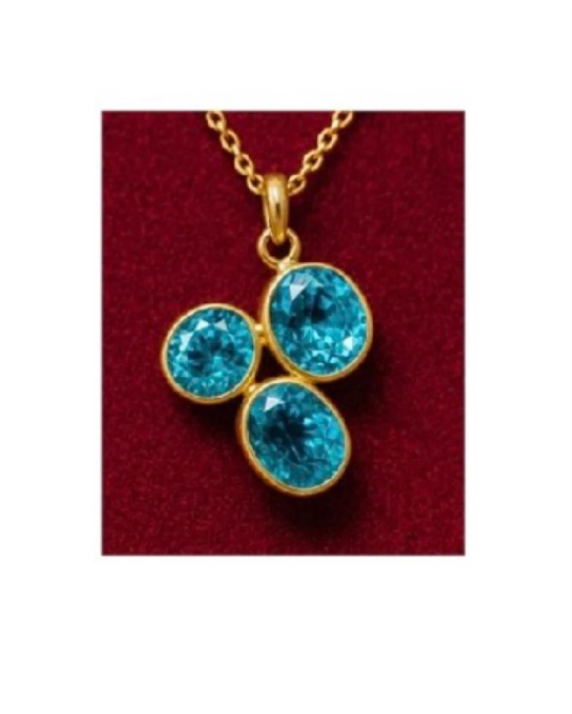 One stamped 10KT yellow gold pendant with a bright polish finish. Features three bezel set oval cut natural blue zircons, measuring 6.00 x 5.00 x 4.97mm. Total weight of colored stones is 4.90ct. This piece would be lovely for someone who appreciates fine gemstone jewellery. Appraisal value $1,000.