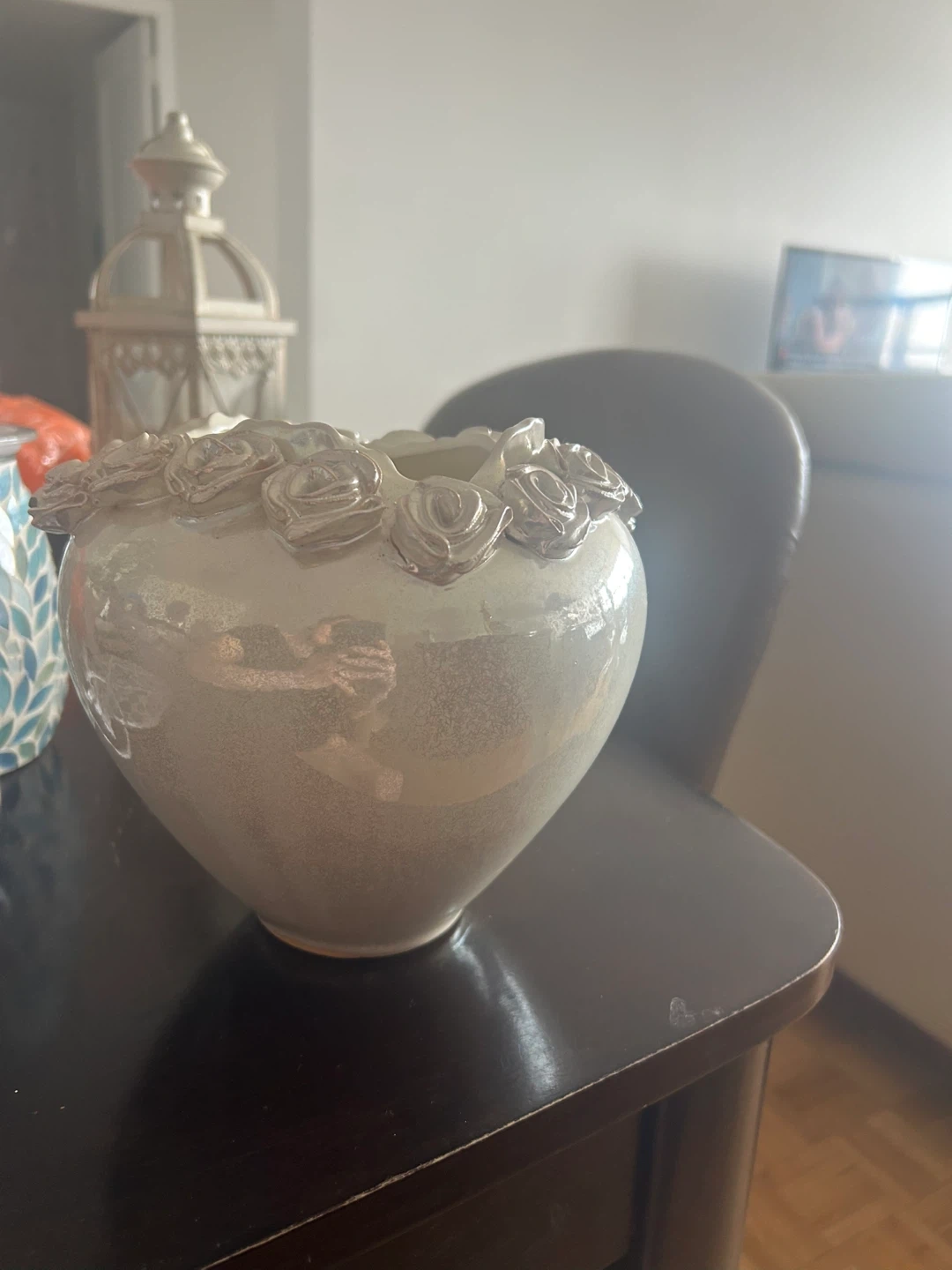 This is a white ceramic vase shaped like a heart. It features delicate rose embellishments around the rim. It's a lovely piece for your home decor.