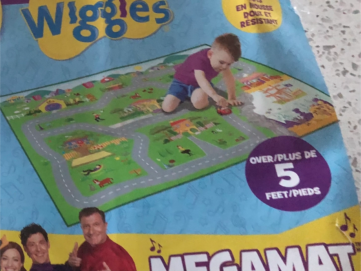 This Wiggles Megamat is made of soft, durable foam. It measures over 5 feet across for lots of play space. Great for toddlers and young children to play with toy cars or figurines!