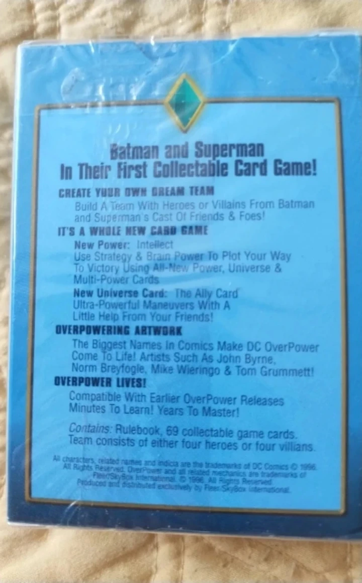 Batman and Superman OverPower Collectible Card Game Starter Deck produced in 1996. It contains a rulebook and 69 collectible cards. Build your own dream team with heroes and villains from DC Comics!