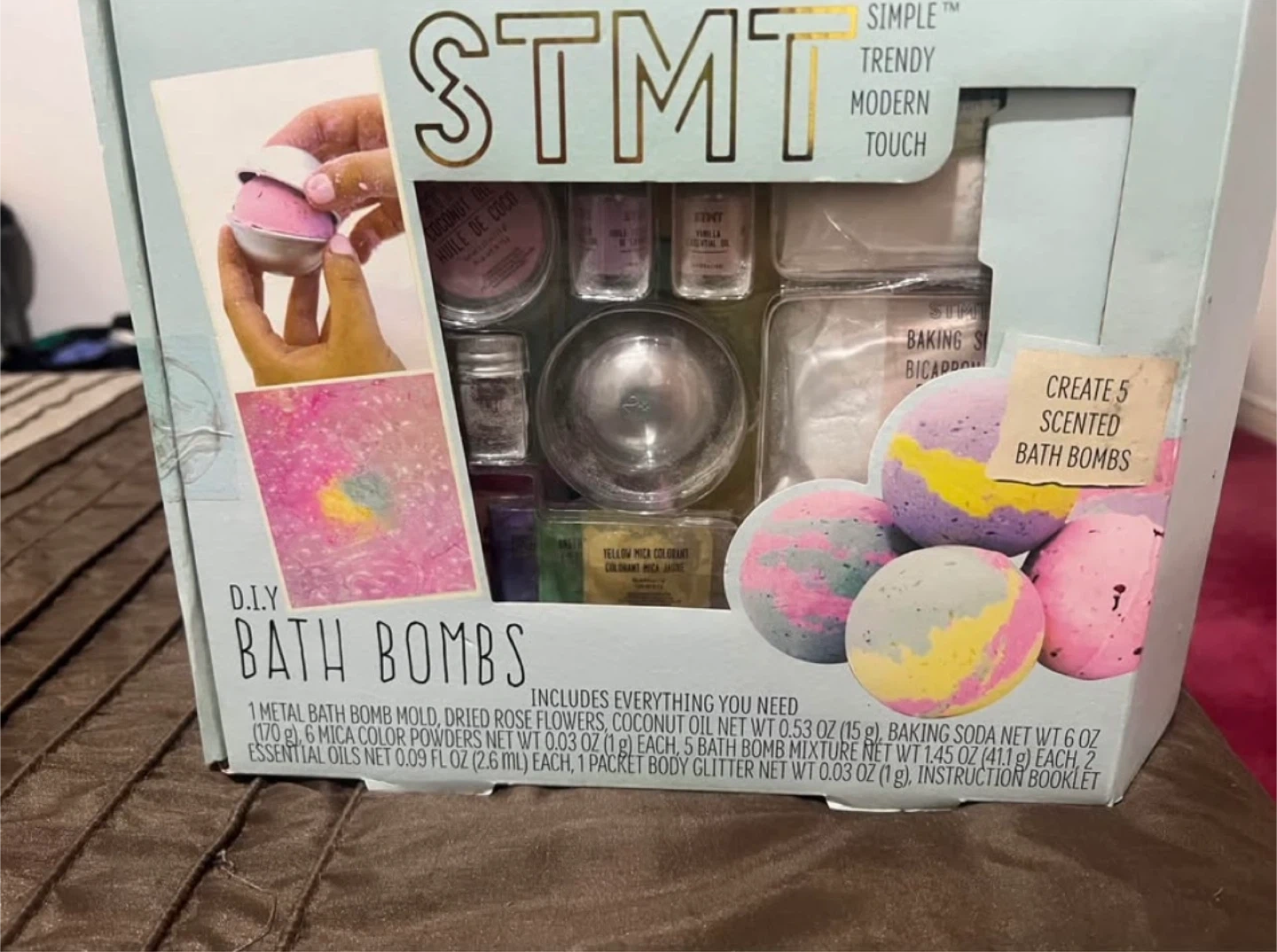 18Looking to create your own bath bombs? This STMT D.I.Y. kit includes everything you need to make 5 scented bath bombs! It includes a metal bath bomb mold, dried rose flowers, coconut oil, mica color powders, baking soda, essential oils and even body glitter! Originally bought for $19.97