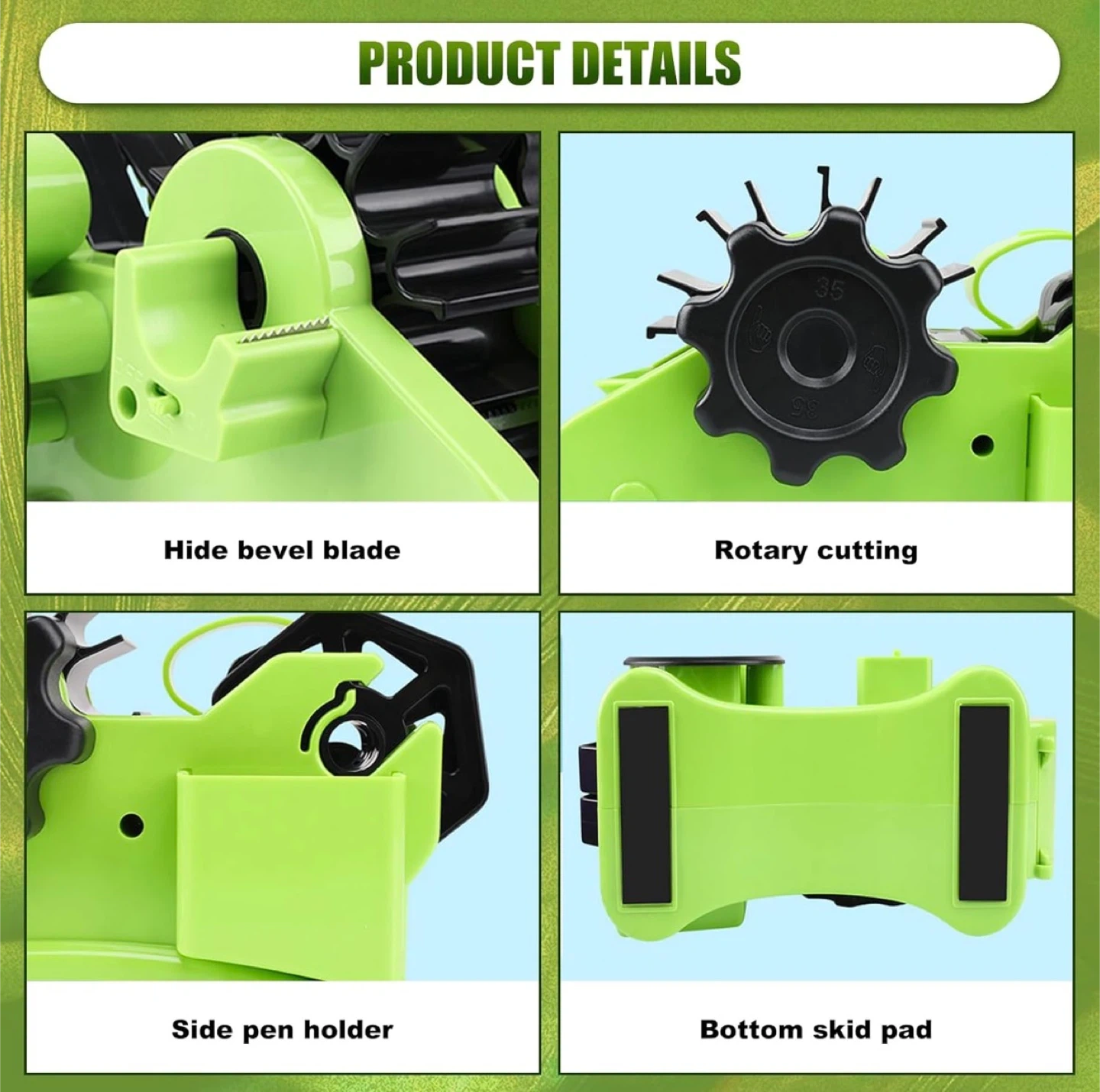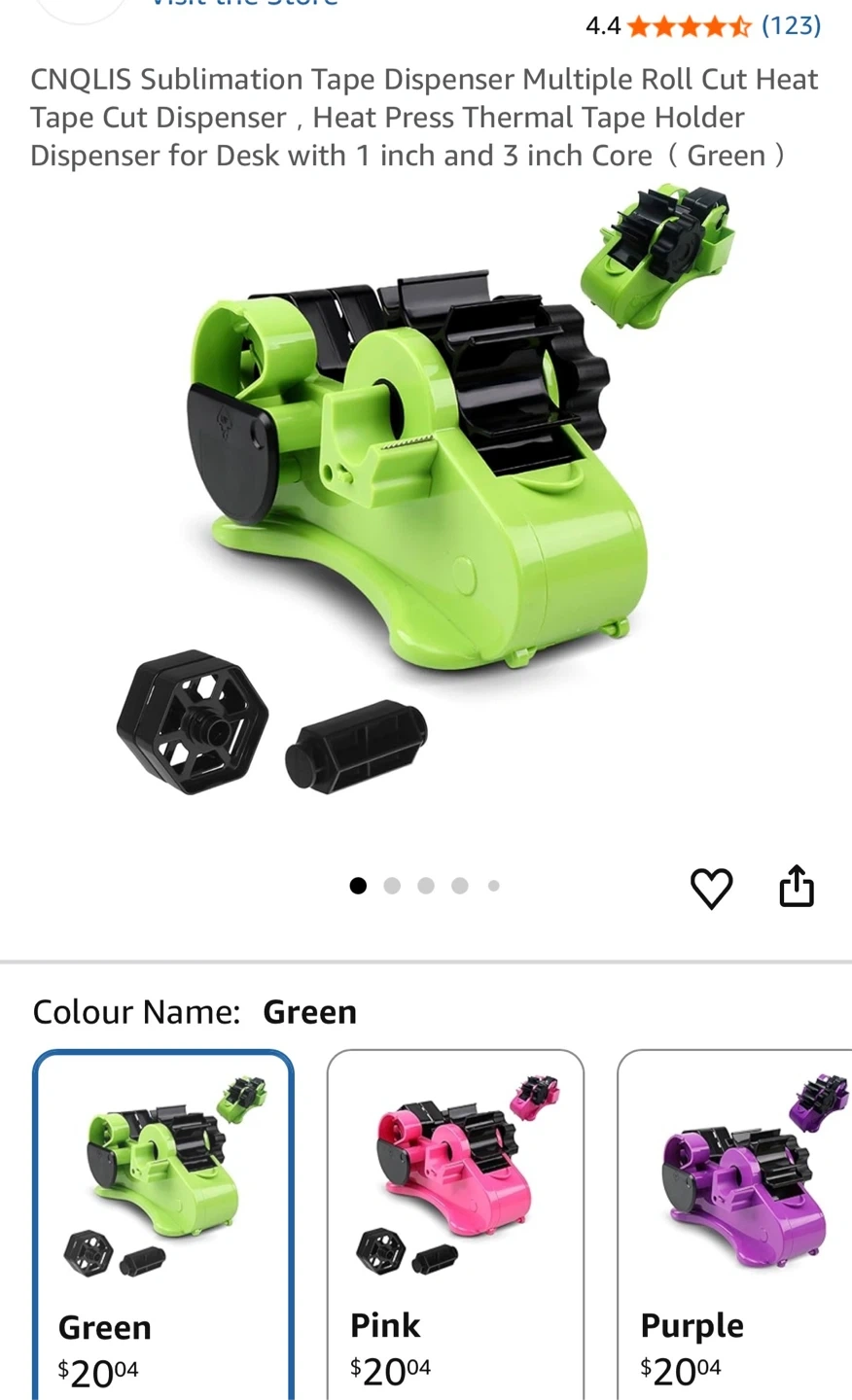 This CNQLIS tape dispenser is designed for sublimation use. It features a hide bevel blade and rotary cutting for precise tape application. It also includes a side pen holder and bottom skid pads for stability. This dispenser accommodates both 1 inch and 3 inch cores.