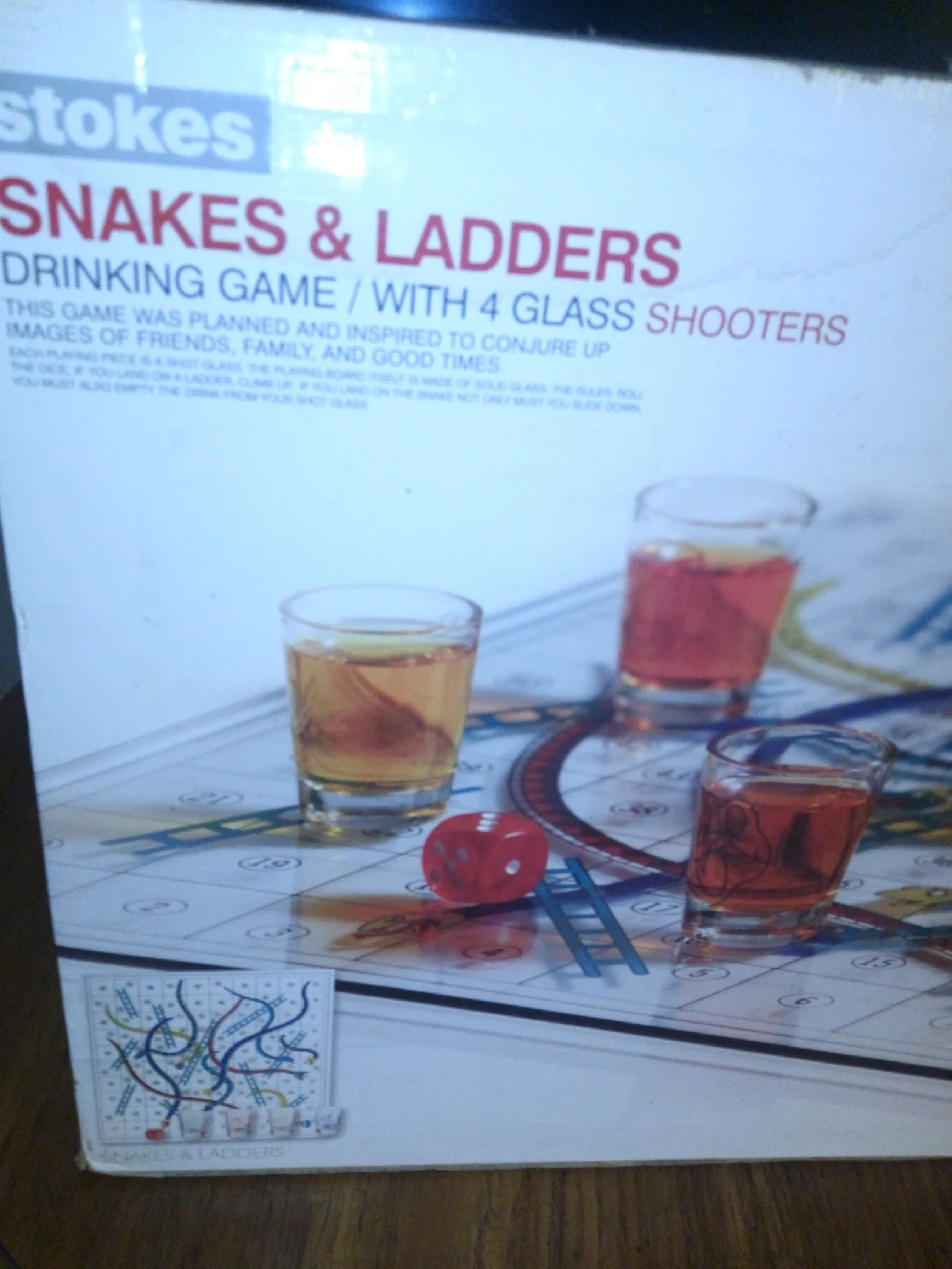 86Stokes Snakes & Ladders drinking game with 4 glass shooters. This game was planned and inspired to conjure up images of friends, family, and good times. Each playing piece is a shot glass. The playing board itself is made of solid glass. The rules: roll the dice. If your playing piece is on a ladder, climb up. If your piece is on the snake not only must you slide down, you must also empty the drink from your shot glass