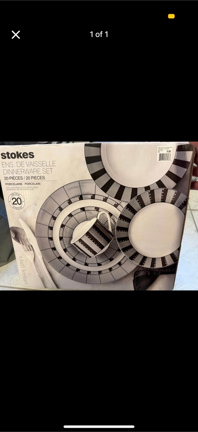 Selling a complete Stokes dinnerware set. The dishes are made of porcelain and are both dishwasher and microwave safe.