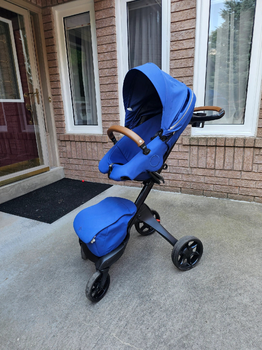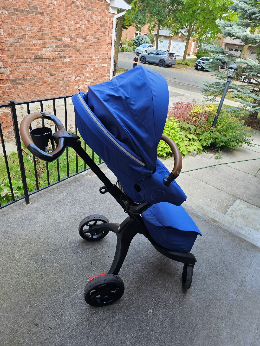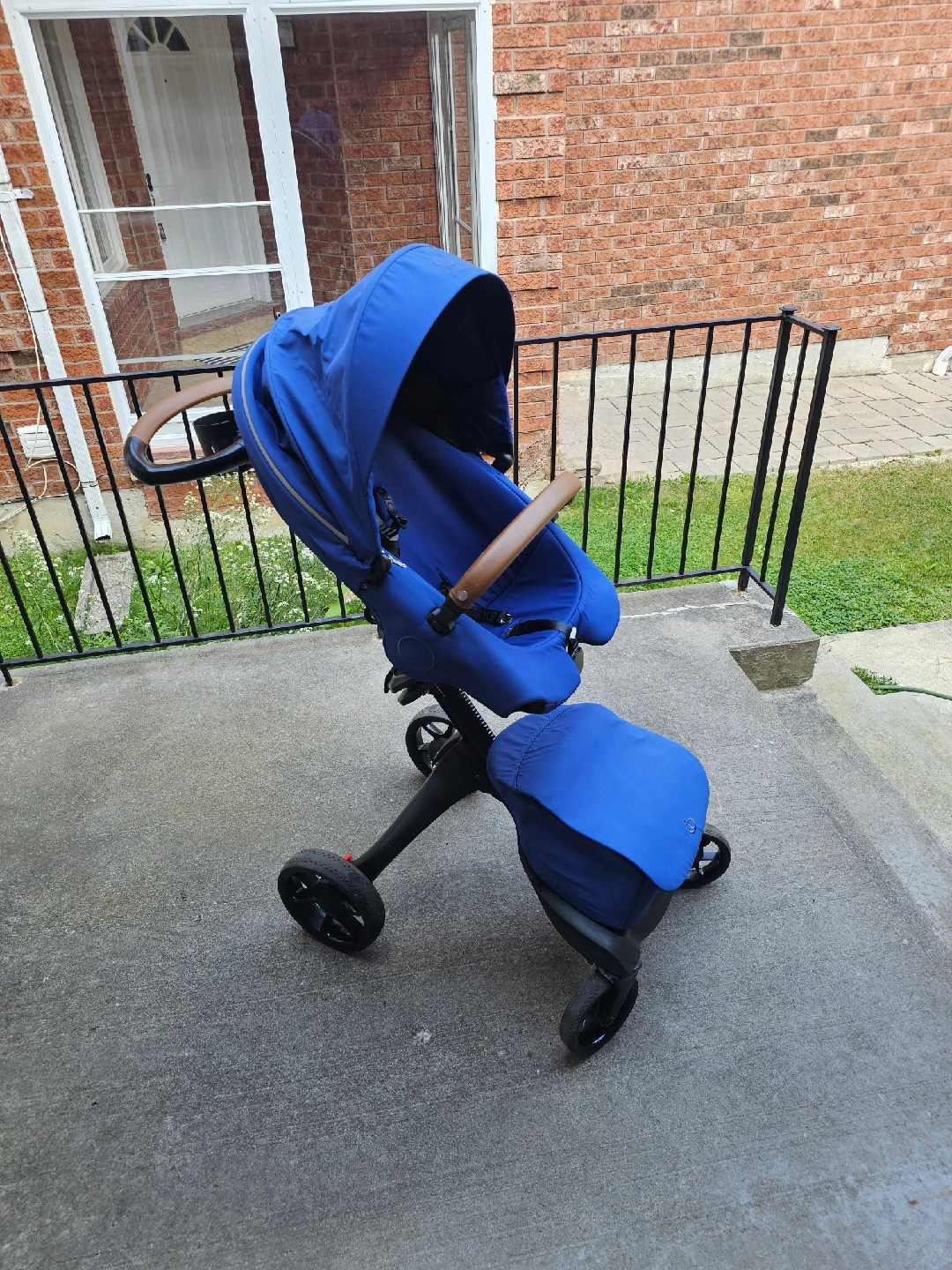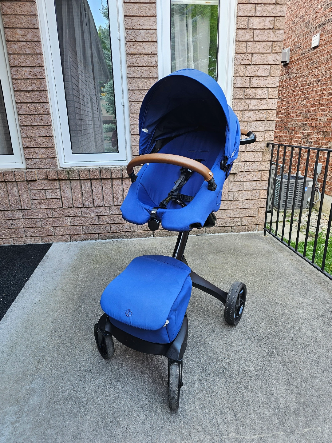 Selling a Stokke Xplory V6 stroller in blue! It's in great condition and ready for a new family. This stroller is known for its adjustable height and comfortable ride for your little one. Perfect for navigating city streets or enjoying a walk in the park