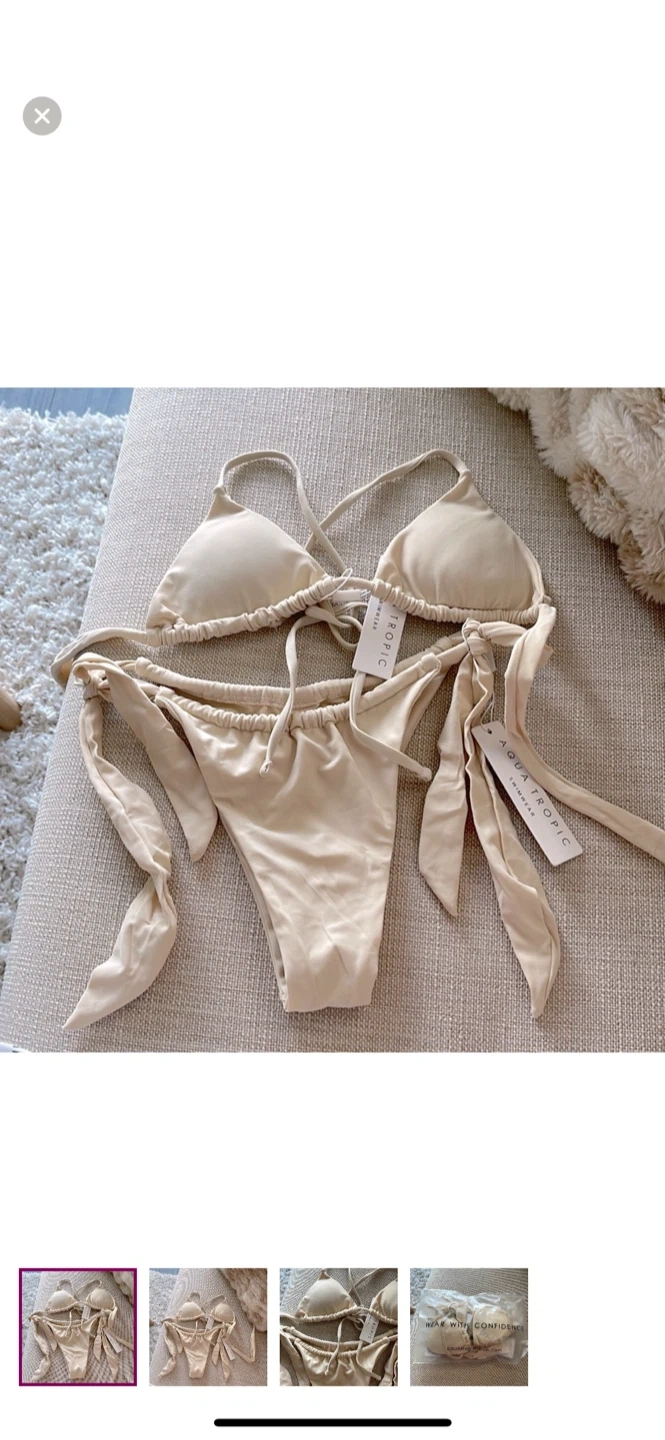 This is a cream-coloured string bikini set from Aquatropic Swim. It features adjustable ties for a custom fit. Made from a soft, stretchy material.