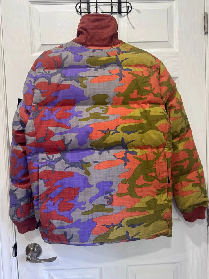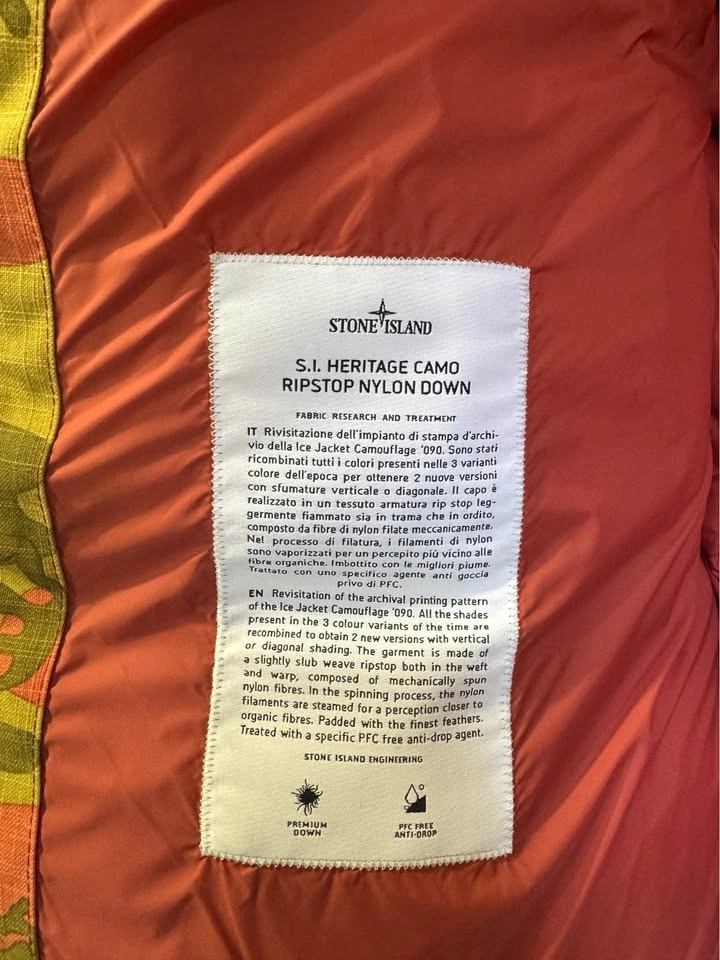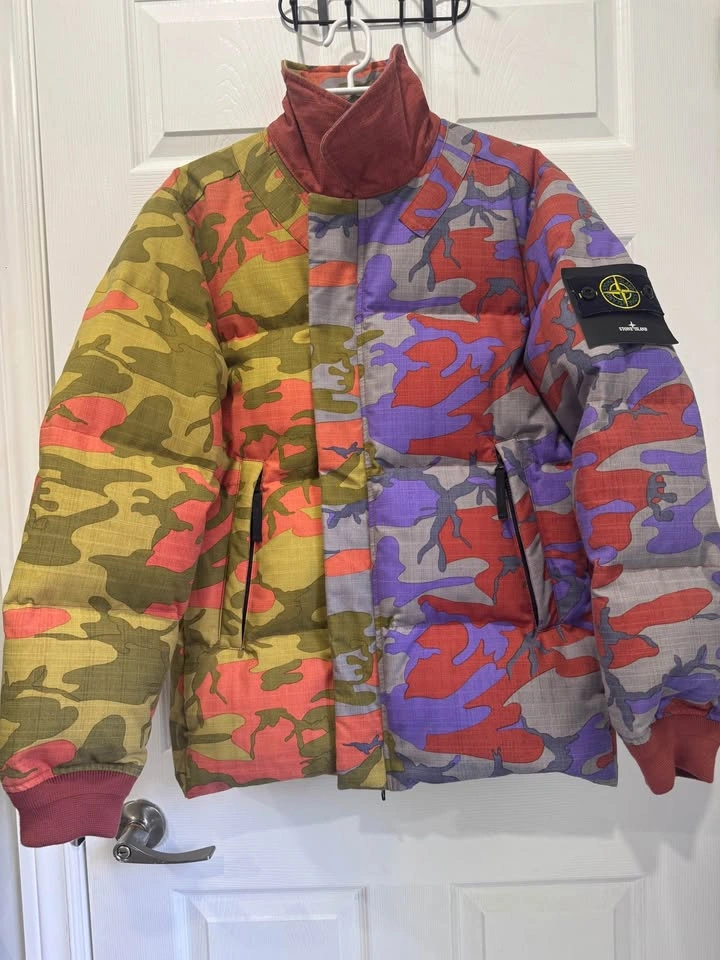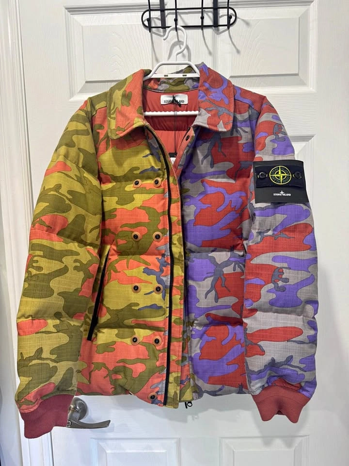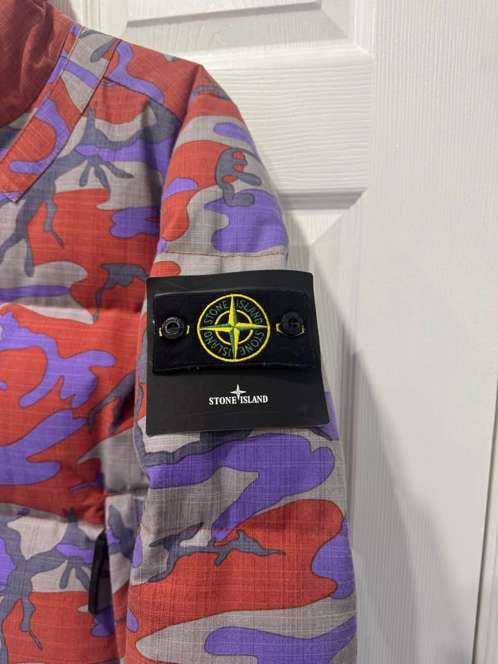 65Authentic Stone Island Heritage Nylon Ripstop Down Jacket – Camo Print. Super rare & seriously stylish piece! This is one of Stone Island’s standout jackets — made in Italy with incredible attention to detail. Constructed from nylon ripstop in a unique archival Ice Jacket Camouflage ‘090’ print, it features a light internal resin coating and is treated with a PFC-free anti-drop finish for extra protection. The jacket comes with premium down insulation (80% eiderdown, 20% feather) for warmth without bulk, along with zip hand pockets, ribbed cuffs, and a concealed two-way front zipper with snap closures. The iconic Stone Island badge sits proudly on the left sleeve. • Made in Italy, • Brand new with tag. • Size - Medium. • Send a good offer. The tag shows €1200, which converts to $2000cad