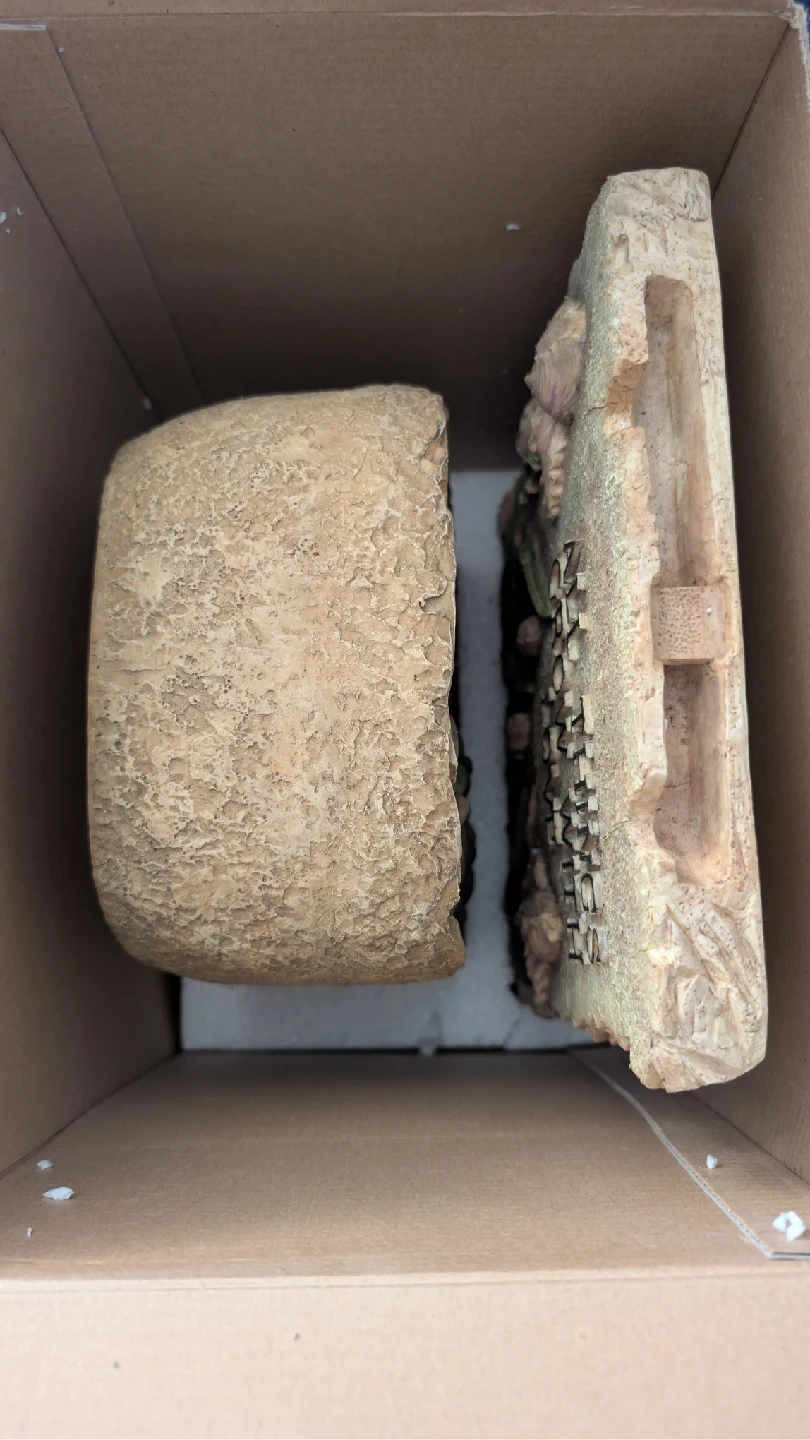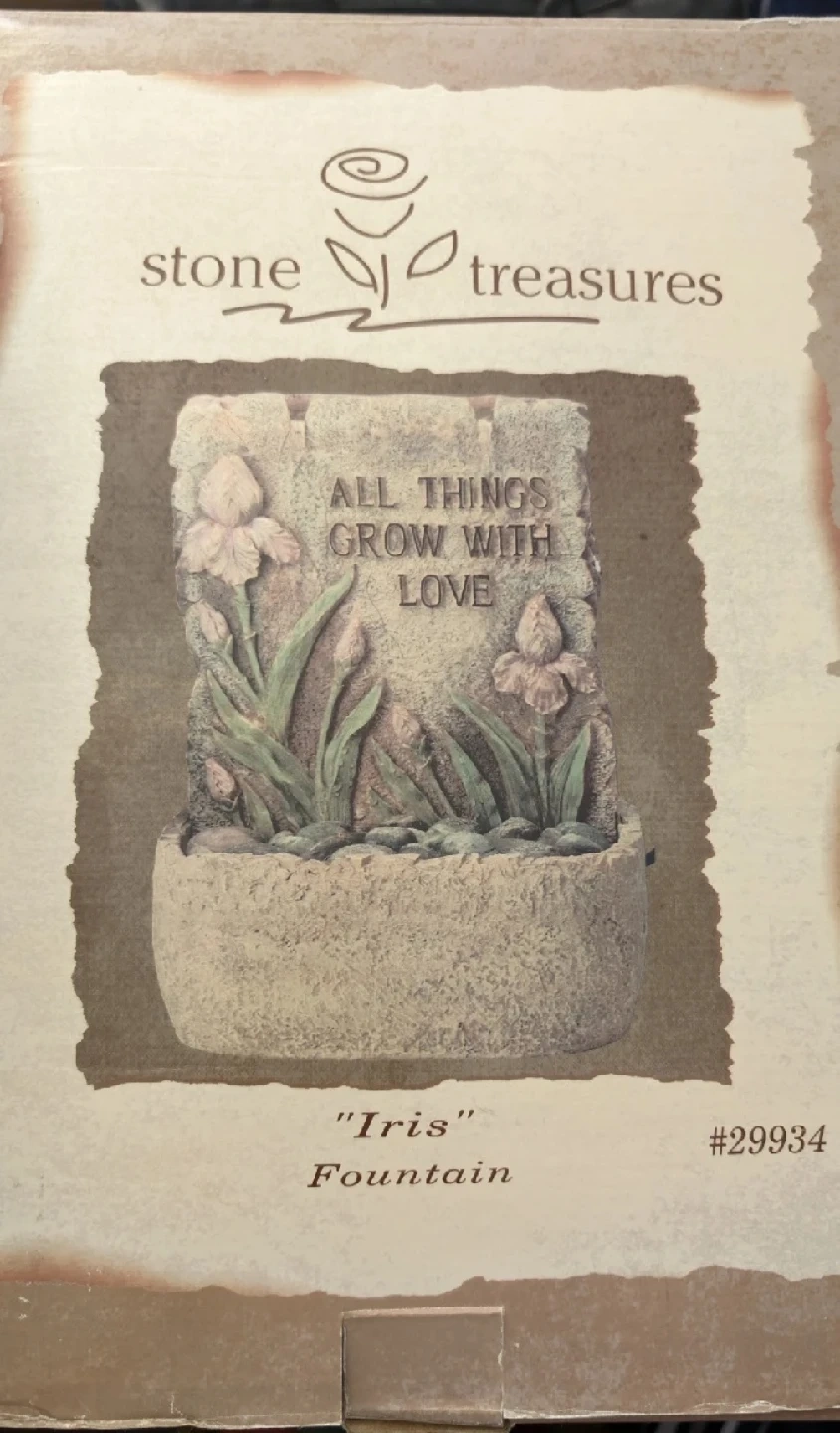 20Selling a Stone Treasures Iris Fountain, model #29934. It features a lovely design with the words "All Things Grow With Love" and a floral motif. This fountain is perfect for adding a touch of tranquility to any space.