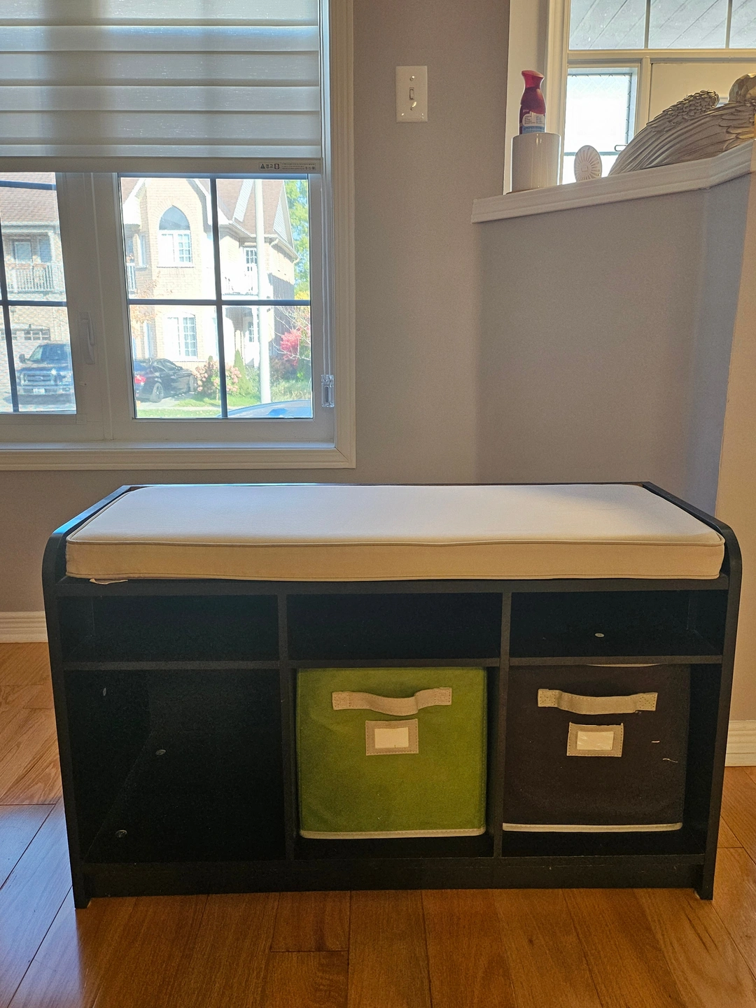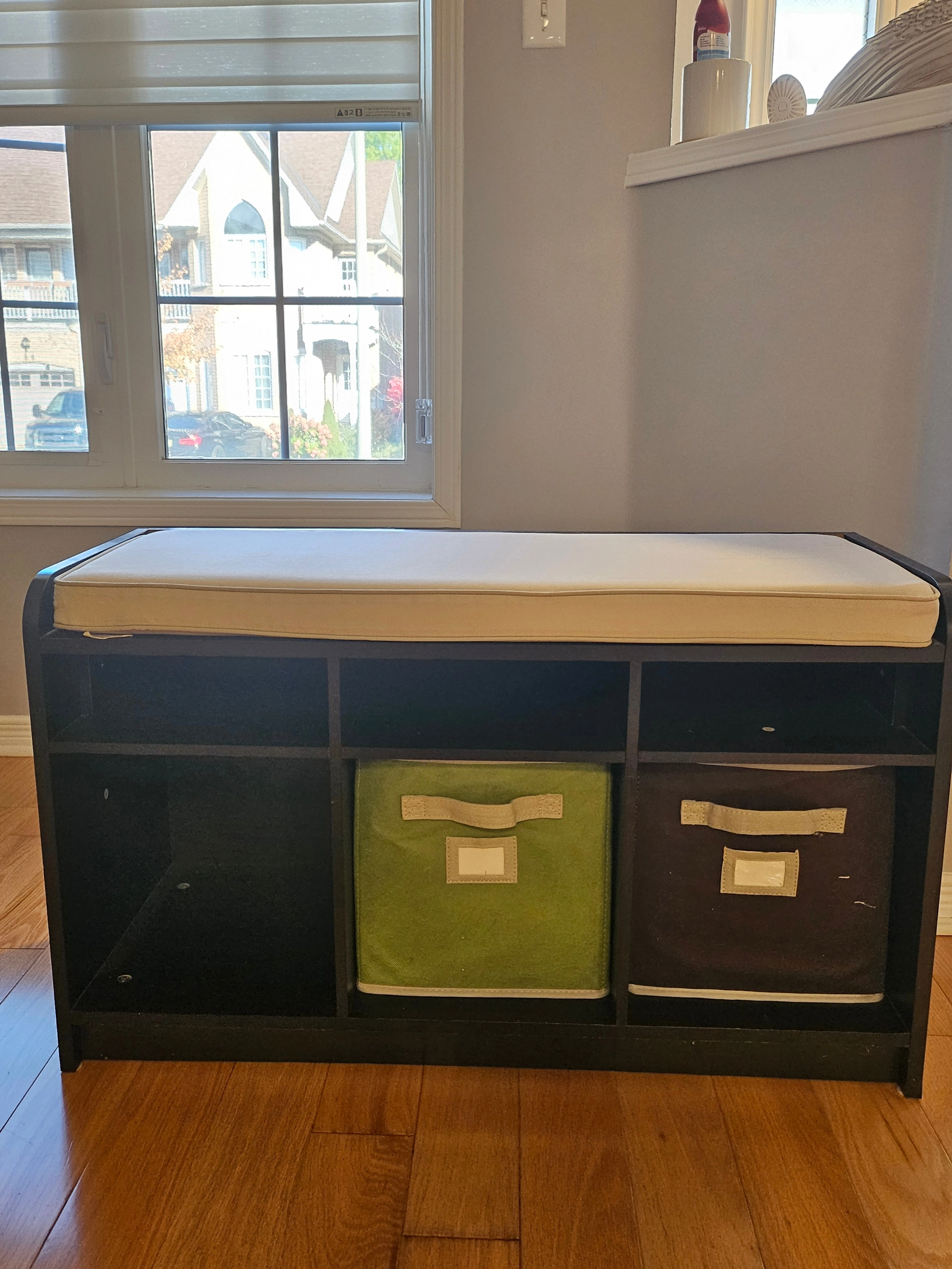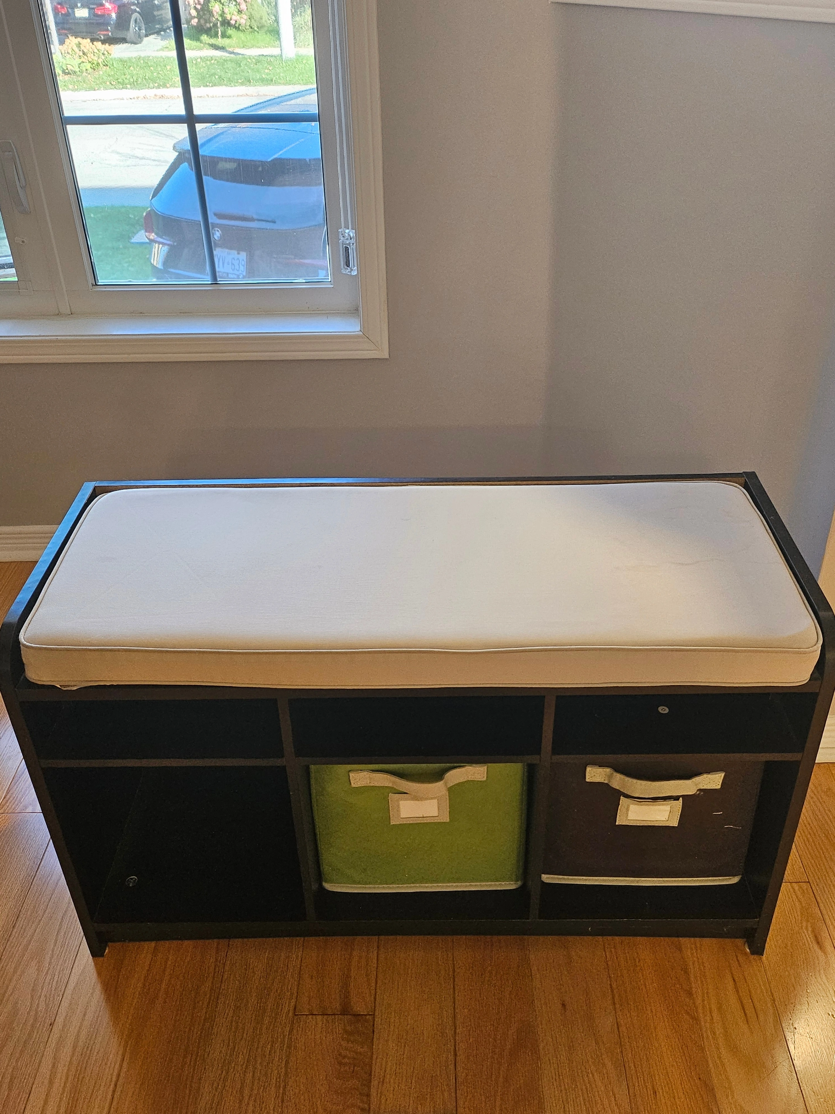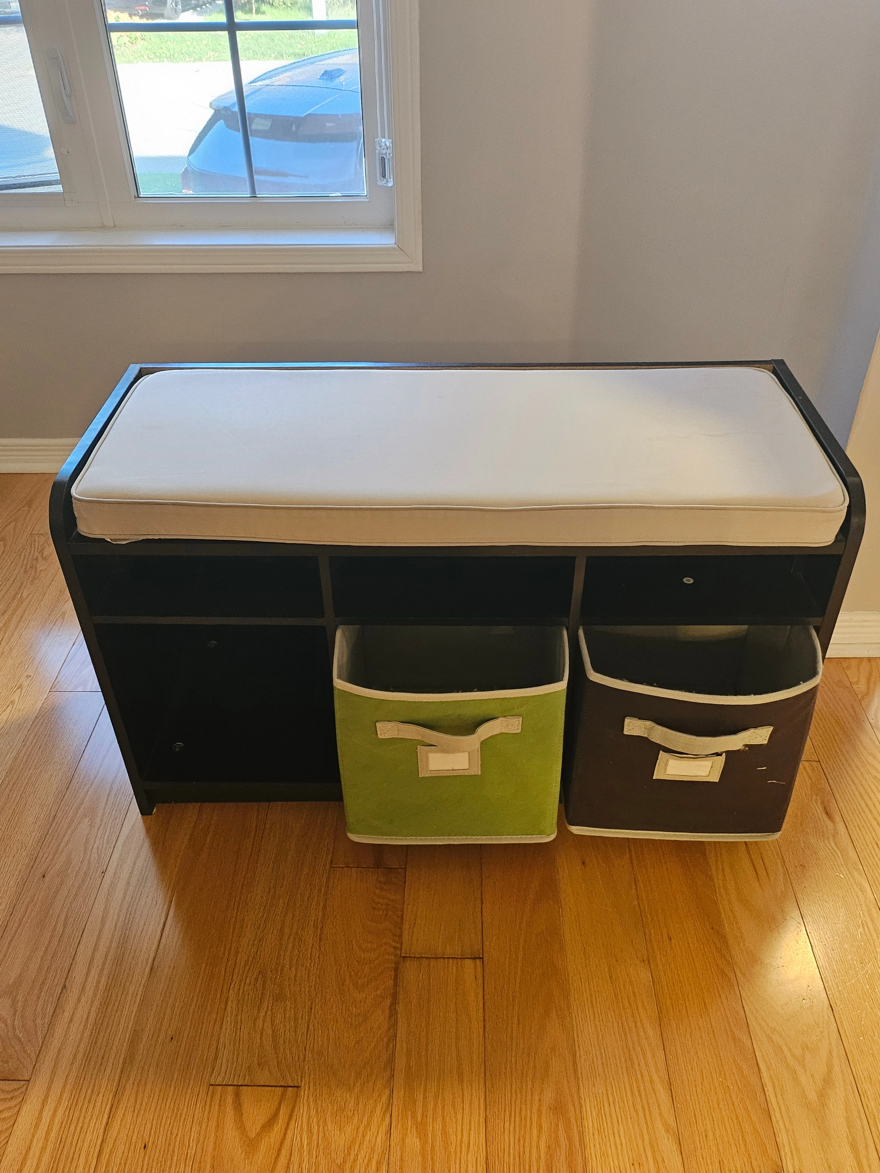 Shoe Bench with Seat Cushion, Entryway Bench with 2 Fabric Drawers for Hallway, Living Room Comfortable Seating Experience: This entryway bench features a breathable linen-feel fabric cushion with a removable and washable cover, ensuring easy maintenance and a comfortable seat at your entrance. Overall dimensions: 35" W x 14" D x 21" H