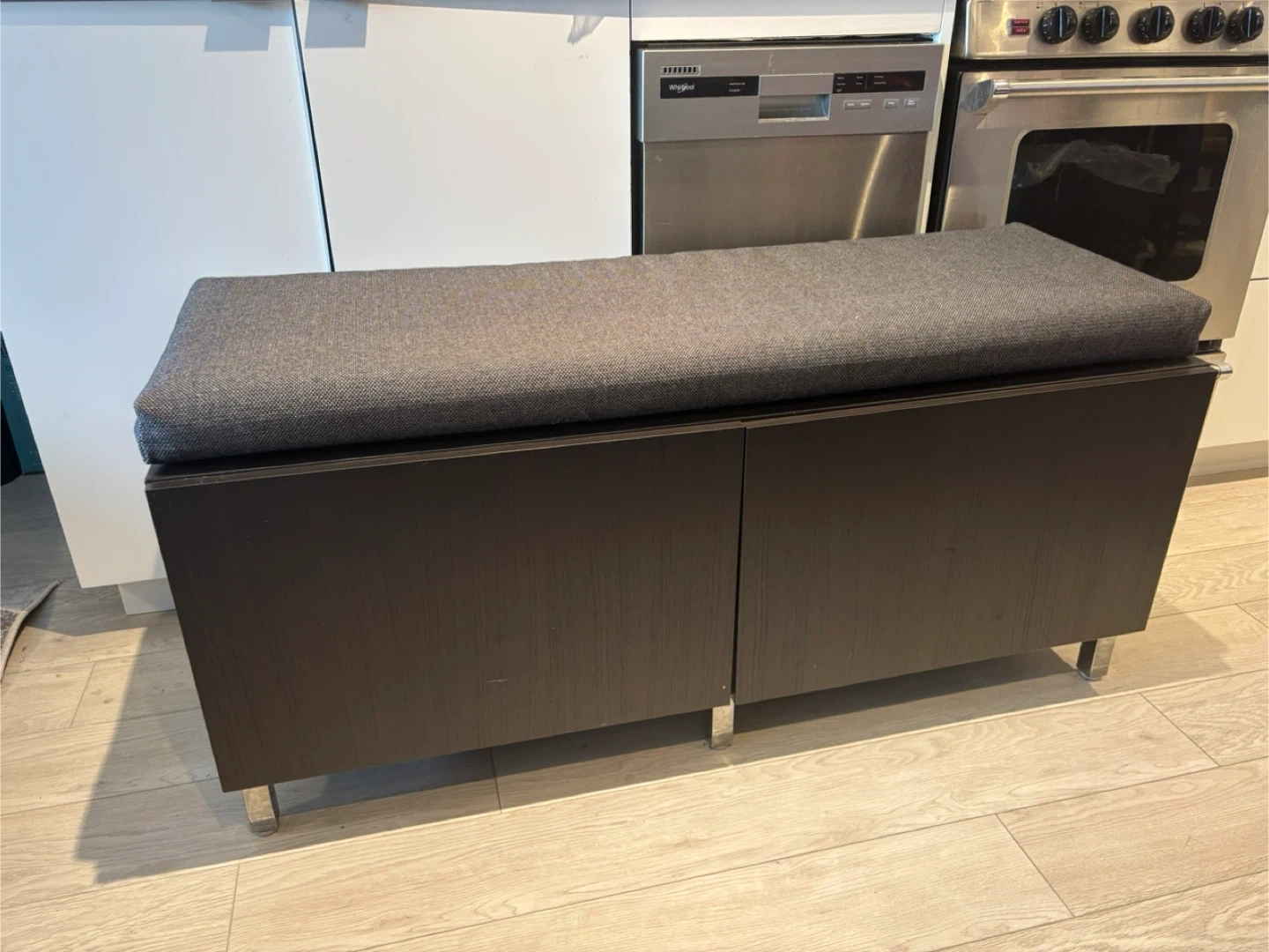 43Storage cabinet with Grey Cushion and 2 doors This is a storage bench with a comfy grey cushion on top. It's great for adding extra seating and storage to any room. The cabinet doors open up to reveal storage space inside. It's in good condition and ready for a new home!