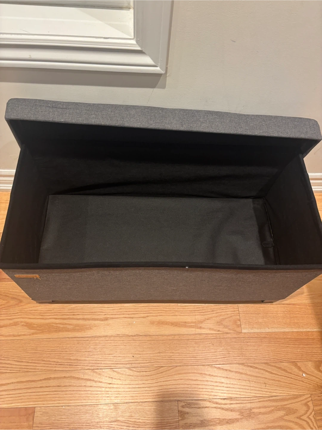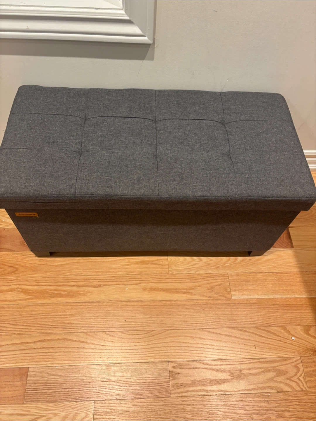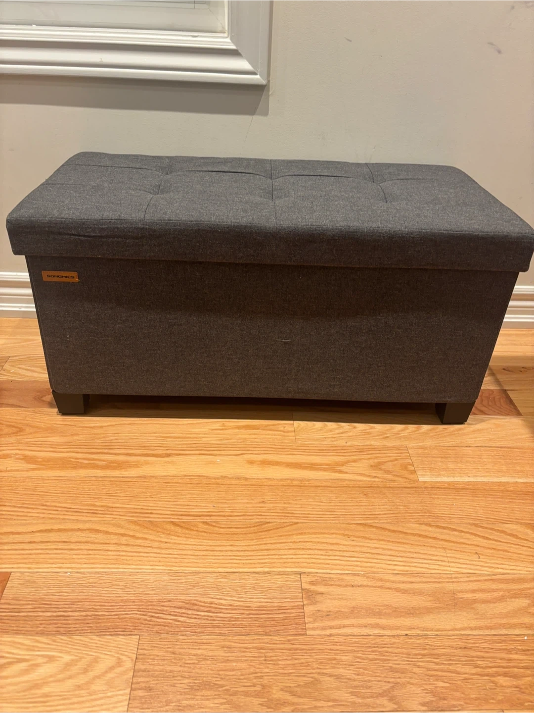 202Selling a SONGMICS storage ottoman bench! It's perfect for adding extra seating and storage to any room. It measures approximately 30 inches in length. The colour is a neutral grey, so it will fit in with any decor