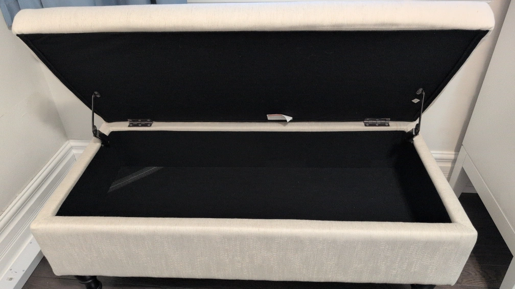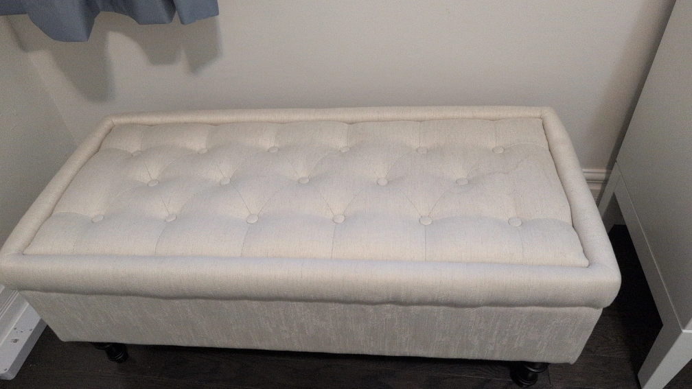 This is a lovely storage ottoman bench! It's in great condition and perfect for storing blankets, pillows, or anything else you need to keep out of sight. The neutral colour will match any decor