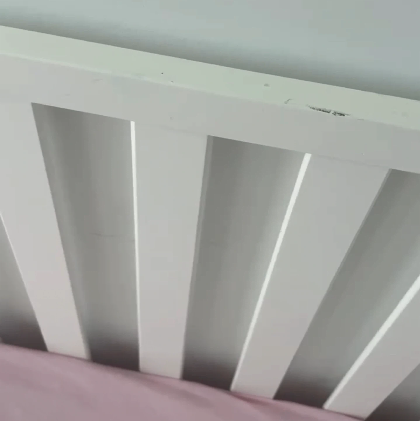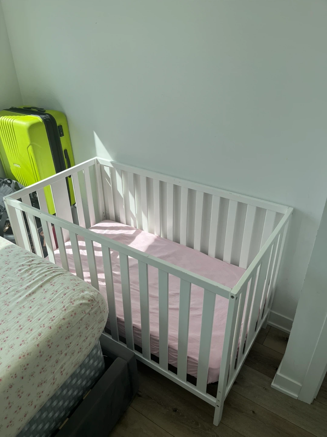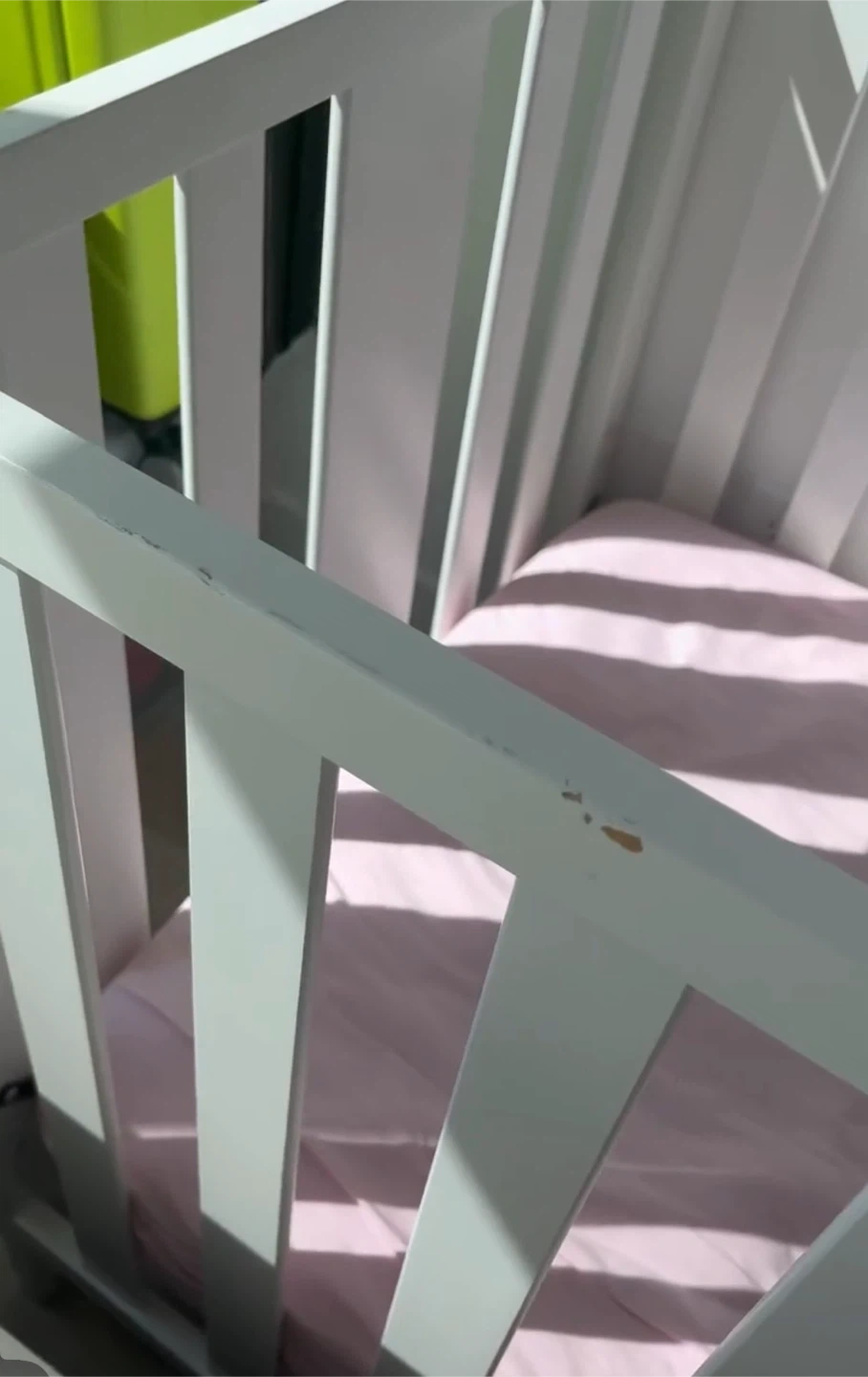 10White crib that turns into a day bed. Mattress included. I can’t find the instructions but I just remember the brand. Scratches are on the edges but other than the cosmetics, it’s in great condition.