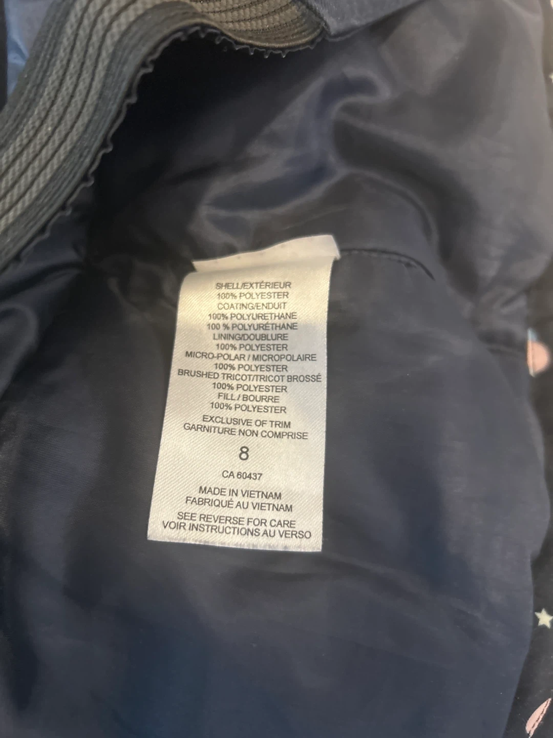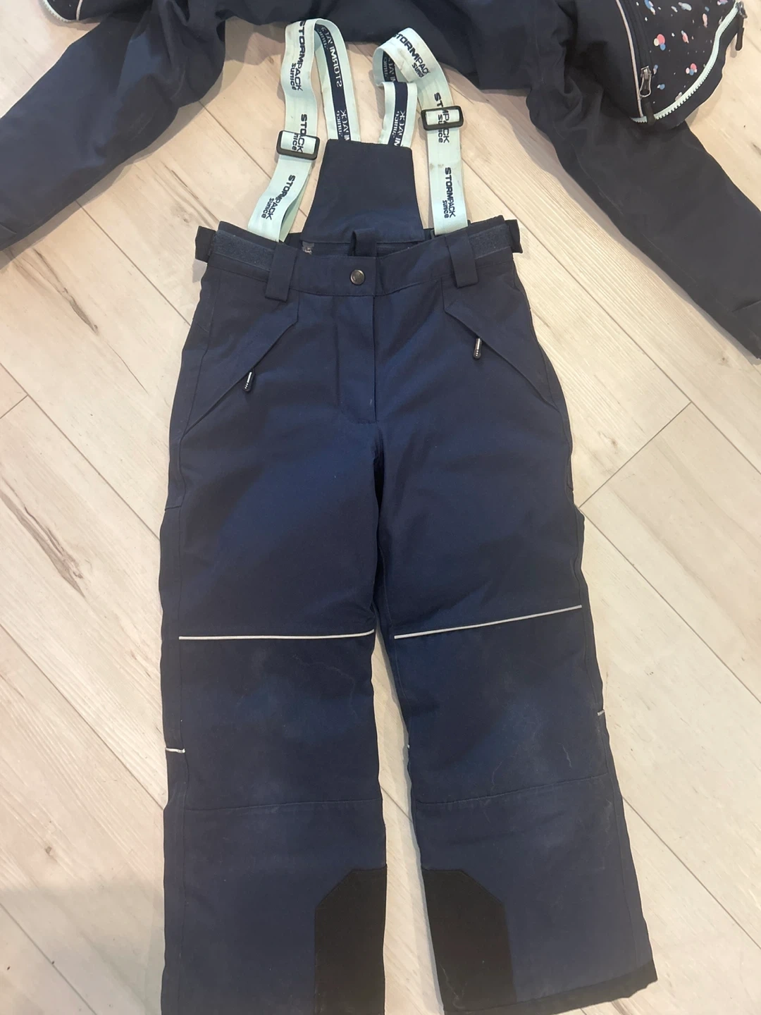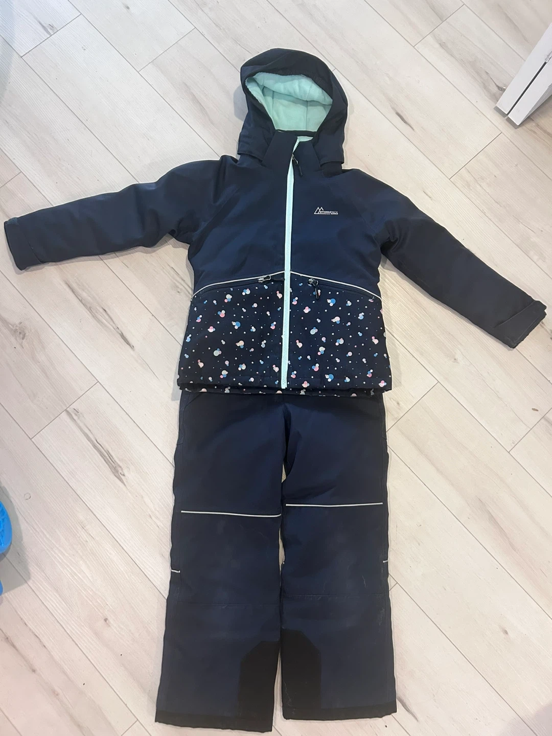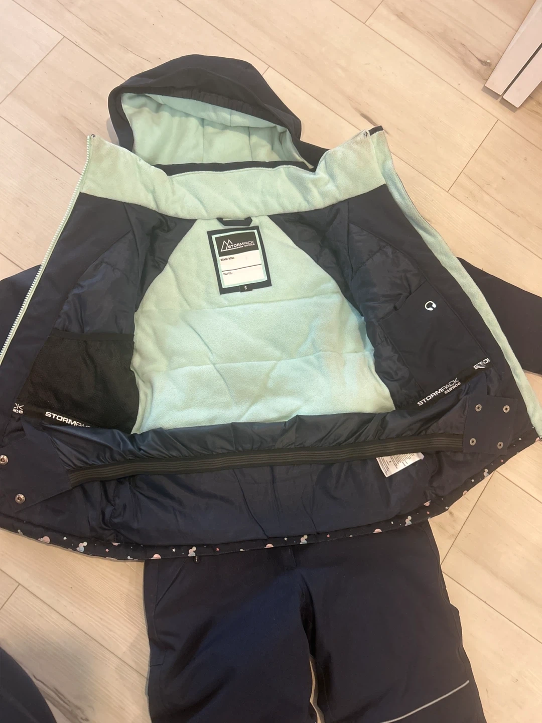 Selling a Stormtech kids' snowsuit in size 8! It's in great condition and ready for some winter fun. The snowsuit features a jacket and pants with suspenders, perfect for keeping your little one warm and dry on the slopes or during outdoor play. The jacket has a cute pattern on the front, and the lining is a soft, light green colour. The shell and lining are made of 100% polyester.