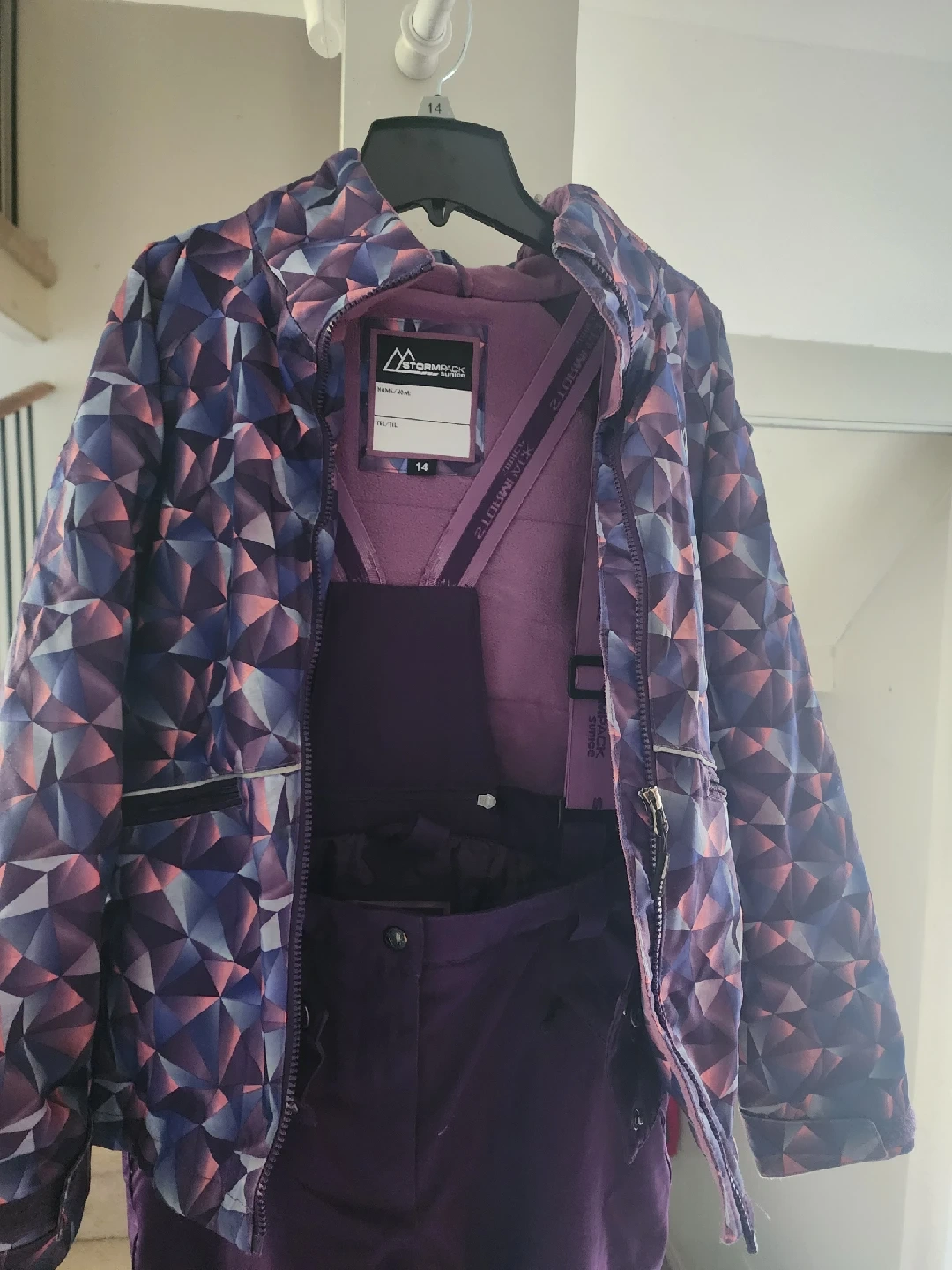 10Selling a Stormway snowsuit in a fun purple geometric pattern! It's a size 14 and includes both the jacket and pants, perfect for hitting the slopes or just playing in the snow