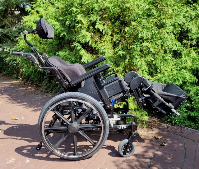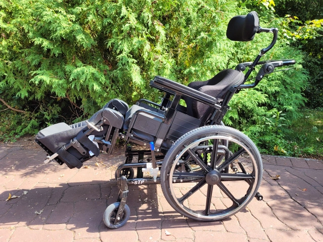 STP Tilt wheelchair with additional headrest and feet supports. Includes leg padding and airflow seat. Padded bucket footrest. Condition: Used - Like new For Sale By: Owner