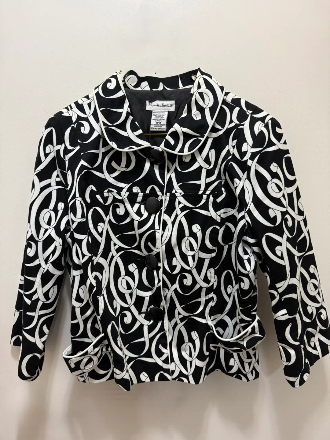 Alexandra Bartlett jacket in a black and white swirl print. It's a size M/M. The outer shell is 100% polyester and the lining is 100% acetate. It features a notched collar and four front buttons.