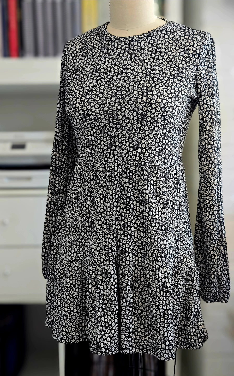 Cute black and white floral mini dress. Can also be worn as a long shirt over a skirt or pants. Long sleeves. Size small. Stradivarius Brand.