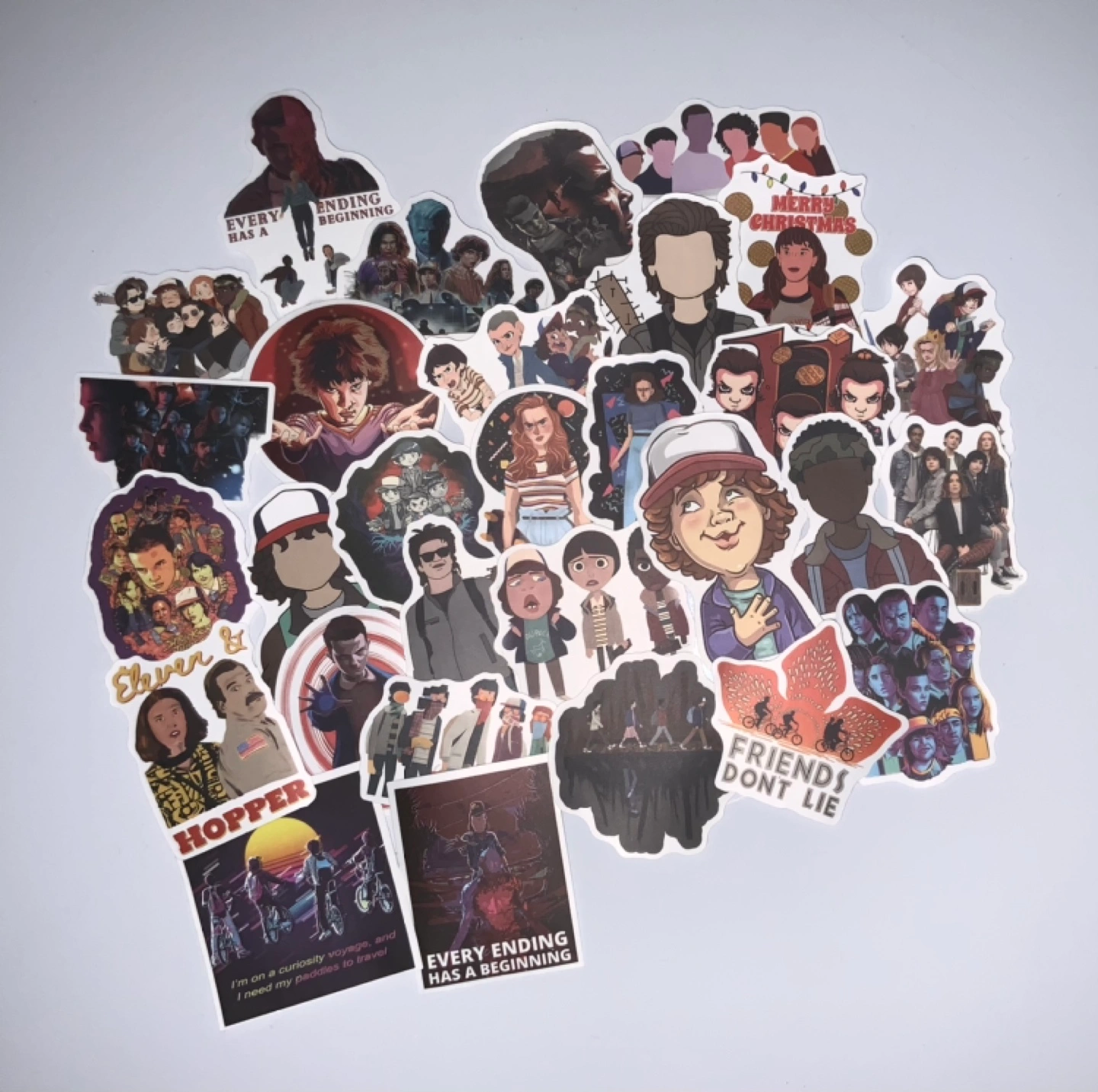 Brand new still in packaging Set of 100 Unique Stranger Things stickers. Various characters, quotes, and scenes from the show. Can be used on water bottles, laptops, phones, bikes, instruments, etc.