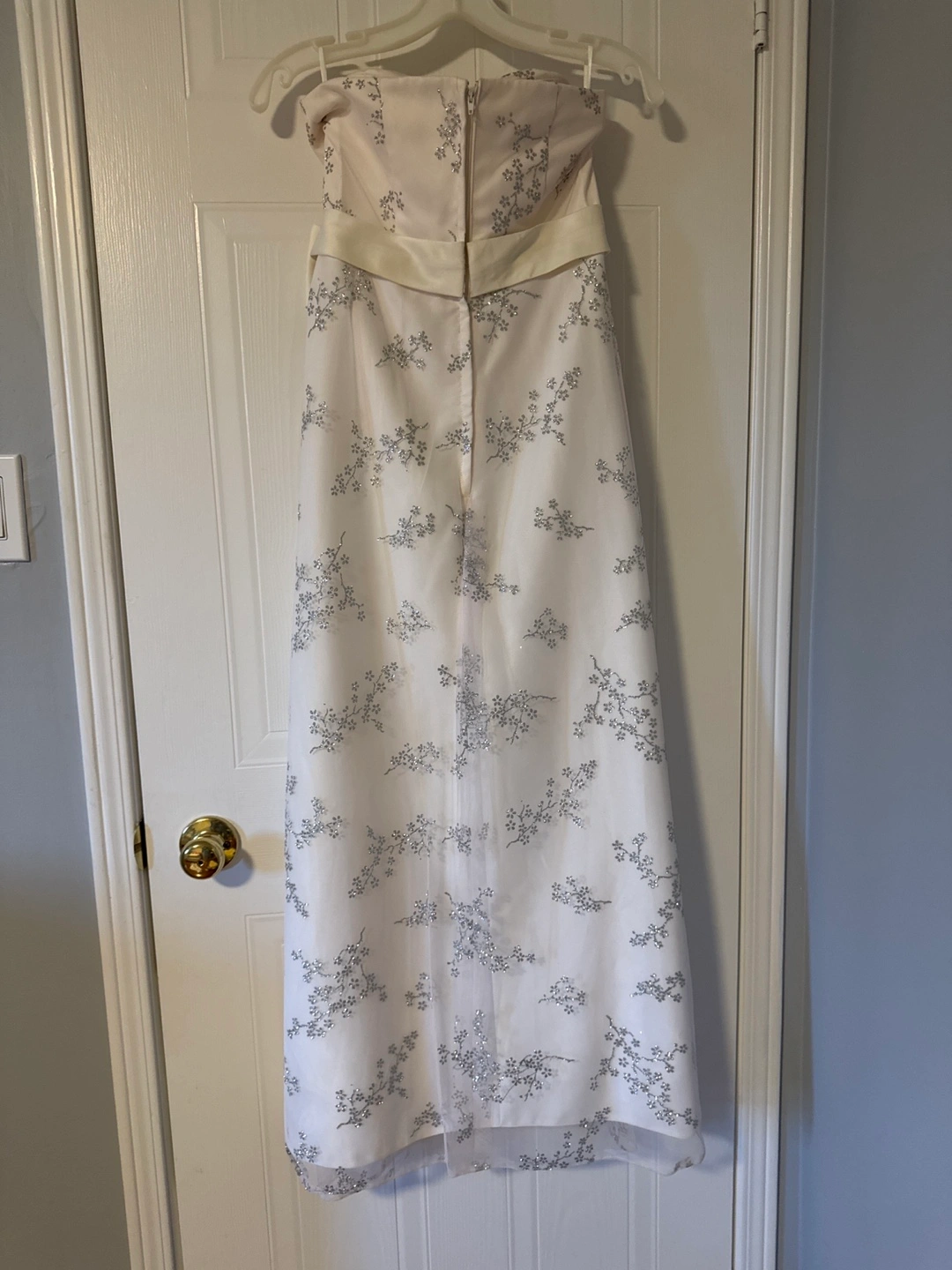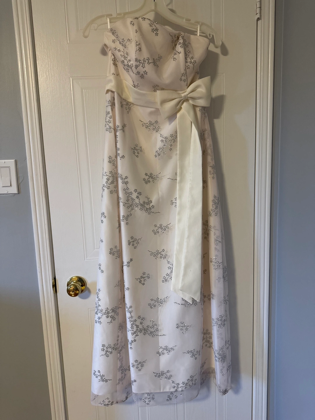 Beautiful, floor-length strapless gown. Features a cream-coloured bodice with silver floral detailing. A satin sash with a bow at the waist. Perfect for prom, special occasion, or wedding.