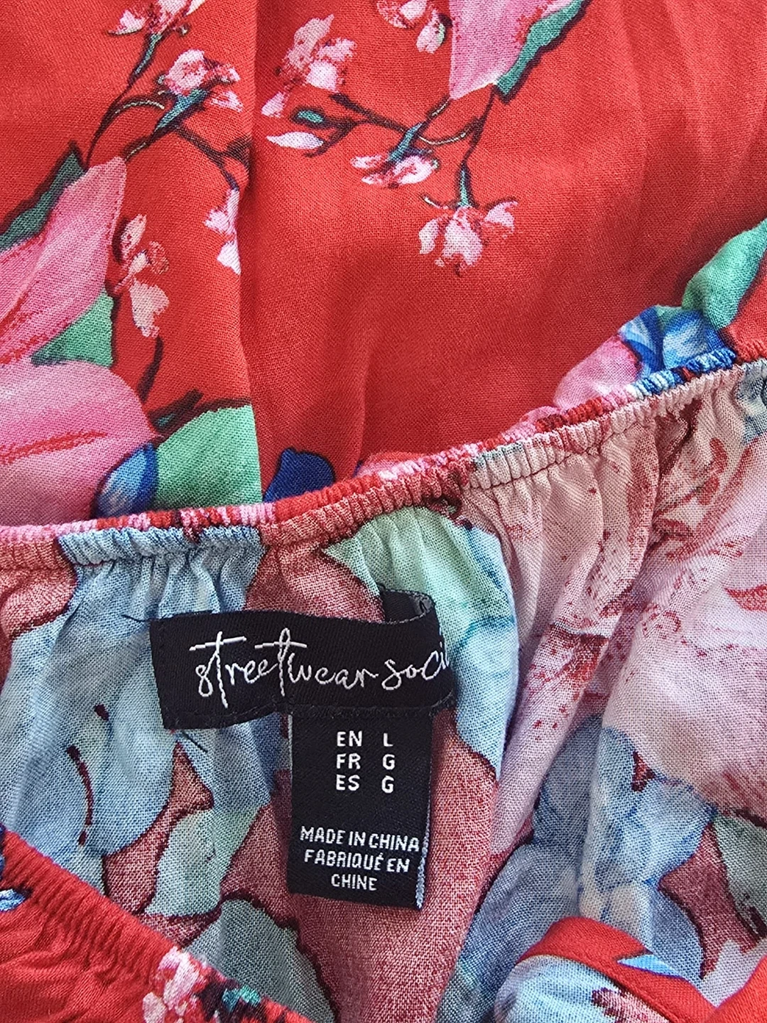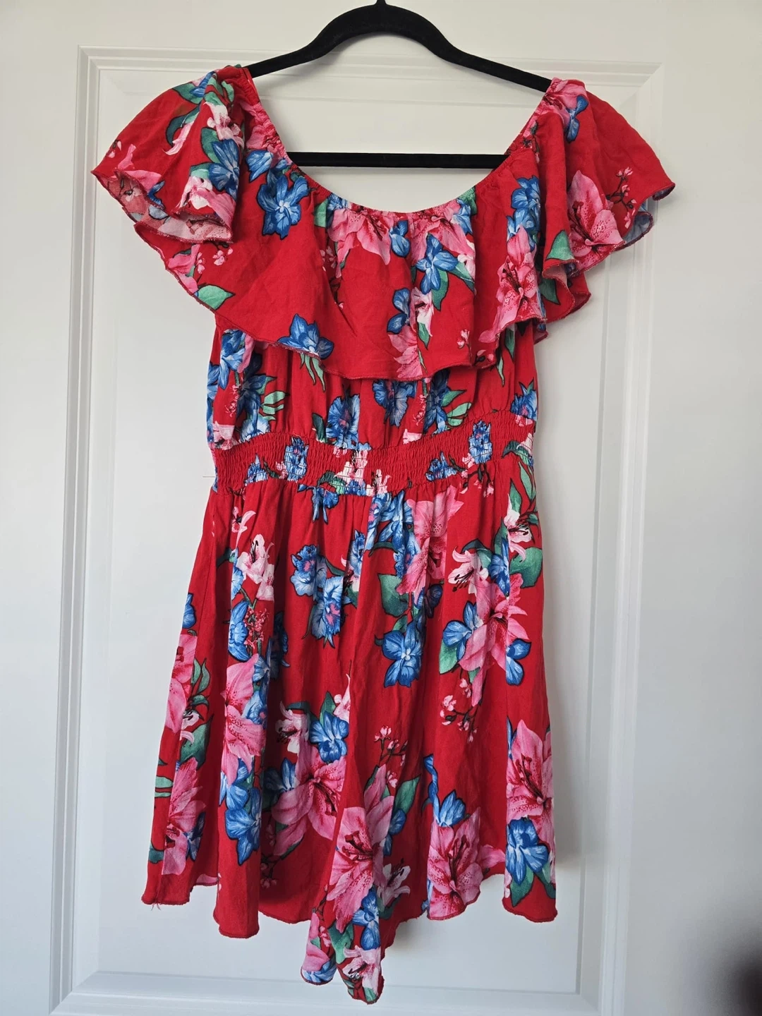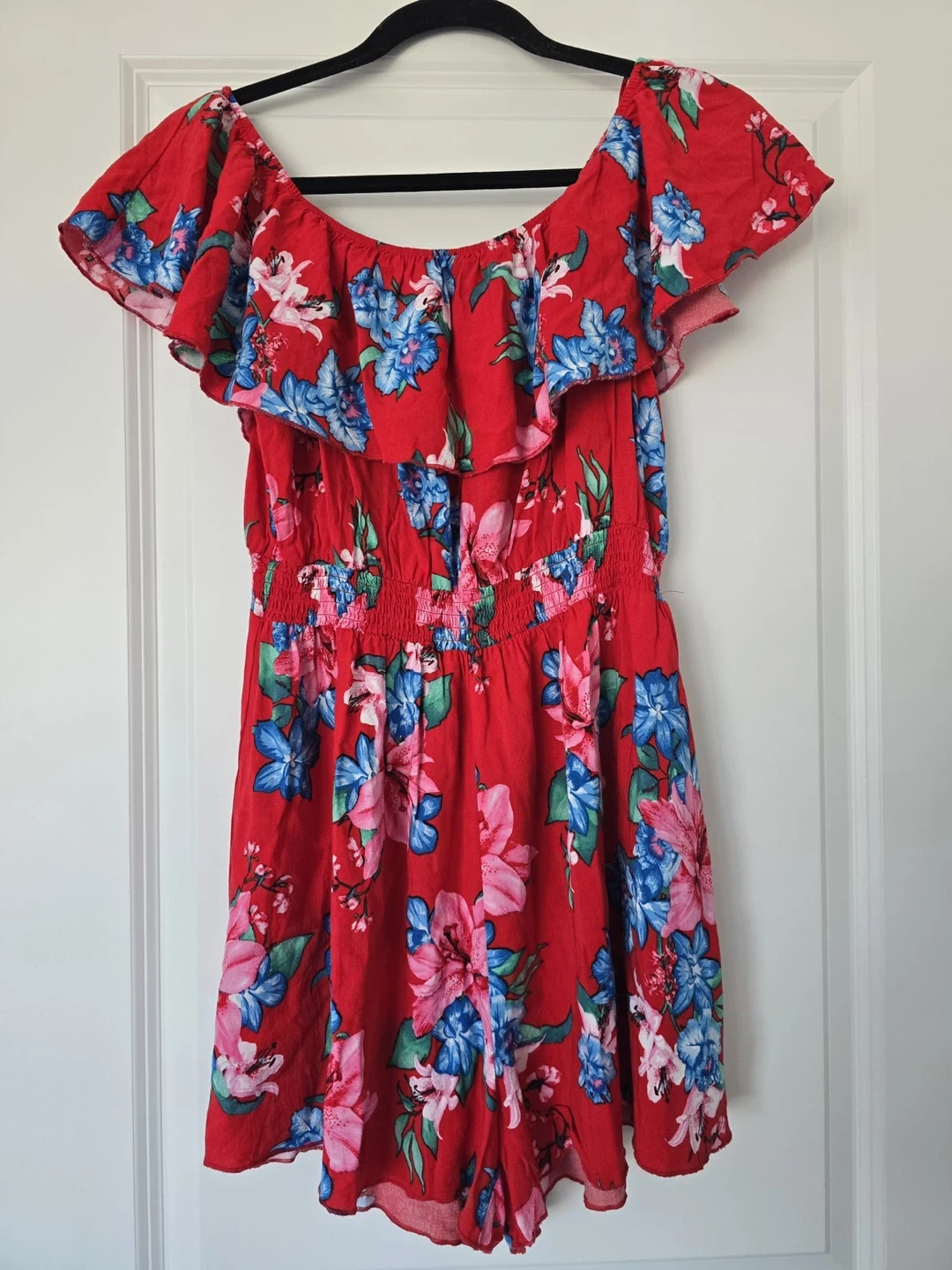 Cute red floral romper from Streetwear Society in size large. Made of 100% rayon, it's lightweight and perfect for summer days! Machine washable for easy care