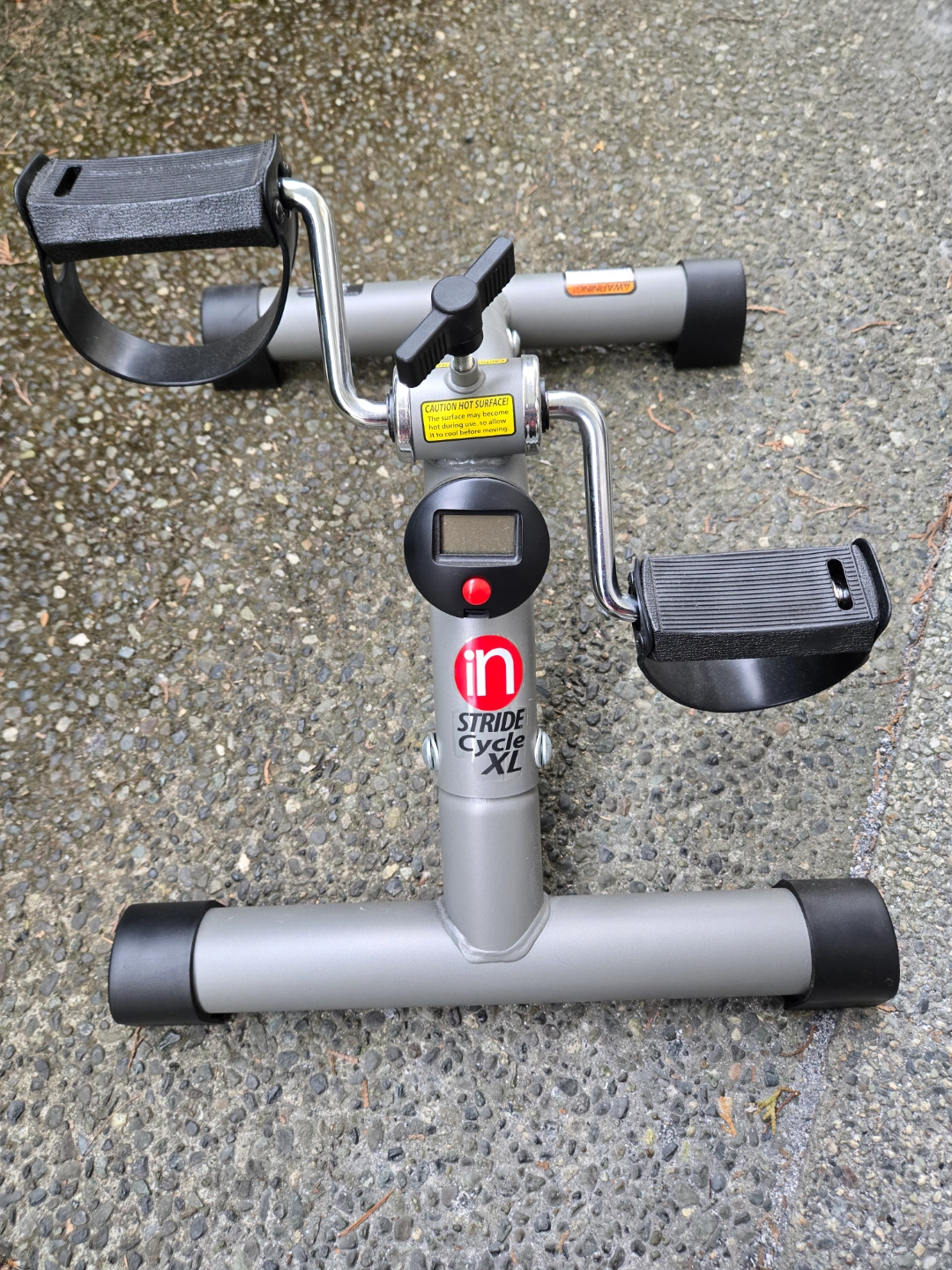 10A new compact exercise bike with pedals. The item features a digital display and a tension adjustment knob. Consider using this to stay active.