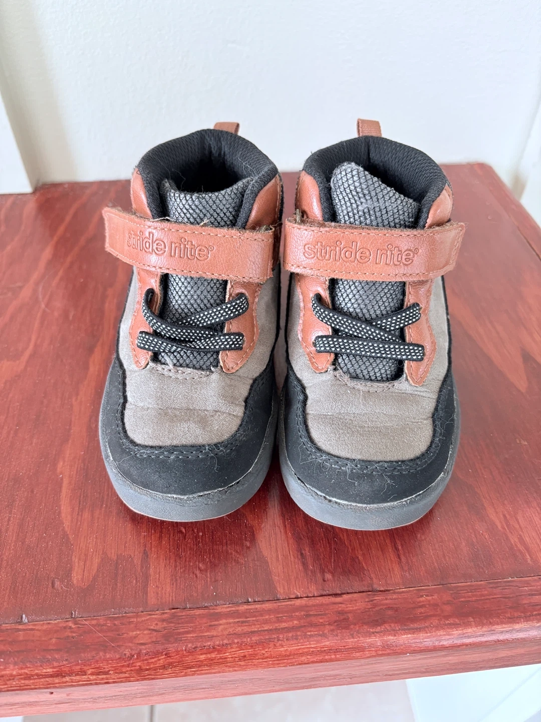 68Here are some Stride Rite toddler boots in a size 7M. They feature a textile and man-made upper with a grey and brown colour scheme. Great for keeping your little one's feet warm and protected!