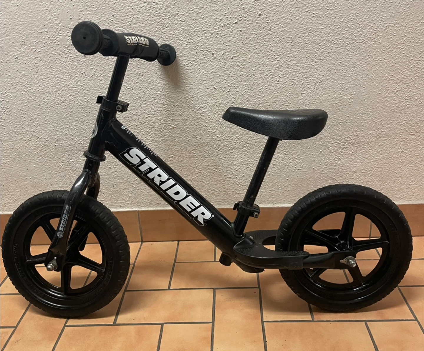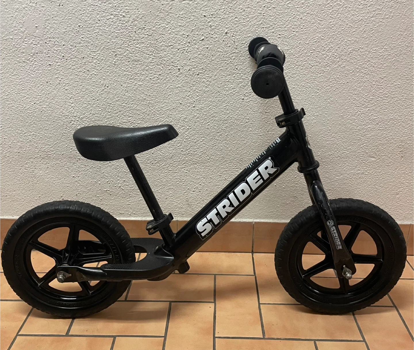 Here's a Strider balance bike in black! It's in great shape and ready for a new rider. Perfect for helping your little one learn to balance before transitioning to a pedal bike