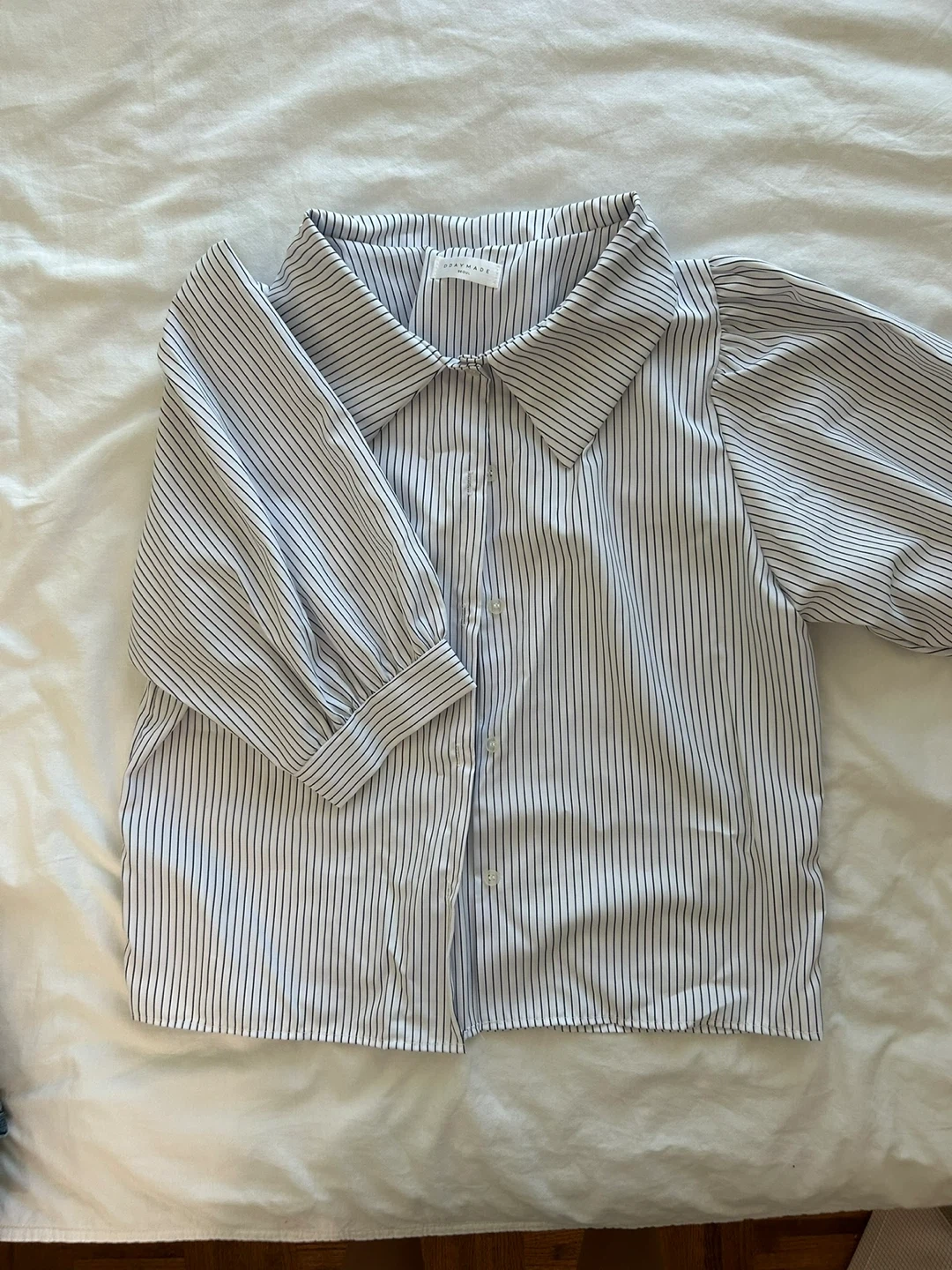 121Selling a blouse with a classic striped pattern. It's in great condition and features a stylish collar and unique sleeve design.
