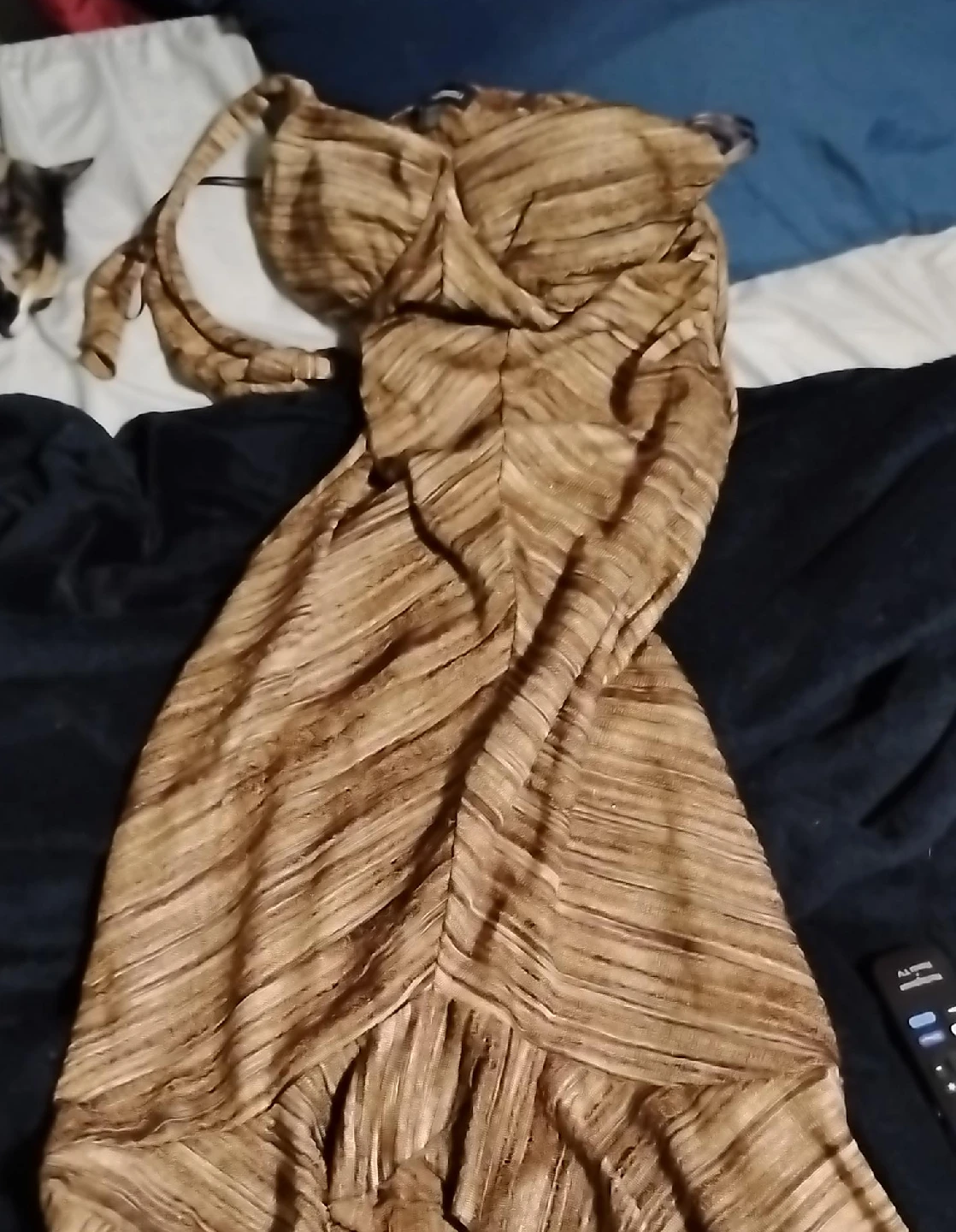 70Striped brown dress. The dress has a unique pattern and a flattering fit. It's perfect for a casual outing or a special occasion!