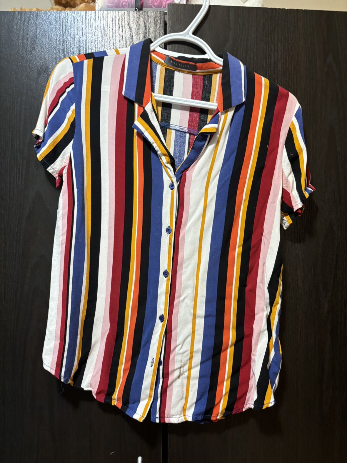 10Short sleeve, button up shirt with a multi-coloured striped pattern. Still in a very good condition.