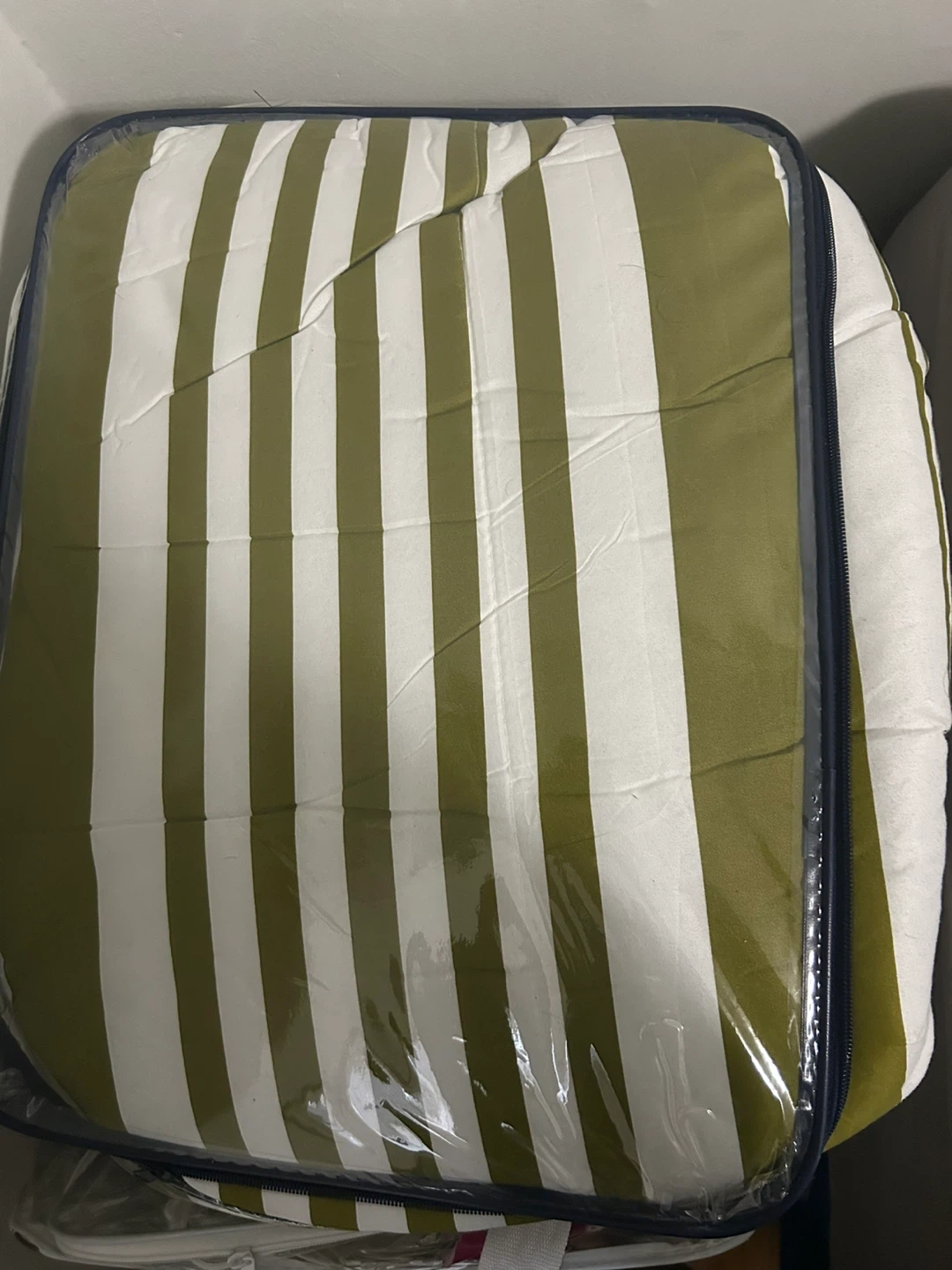 53Selling a comforter set with a stylish striped pattern in olive green and white. It's still in its original packaging, so it's in new condition! Perfect for adding a fresh and clean look to your bedroom.