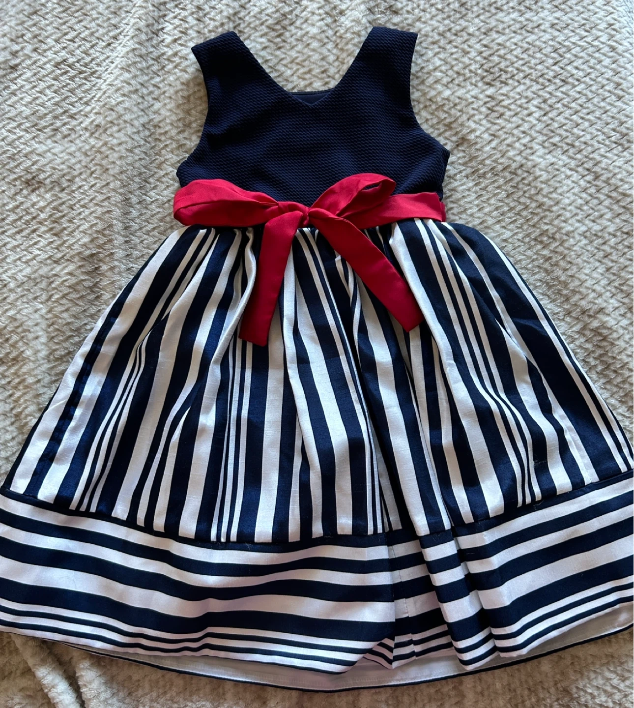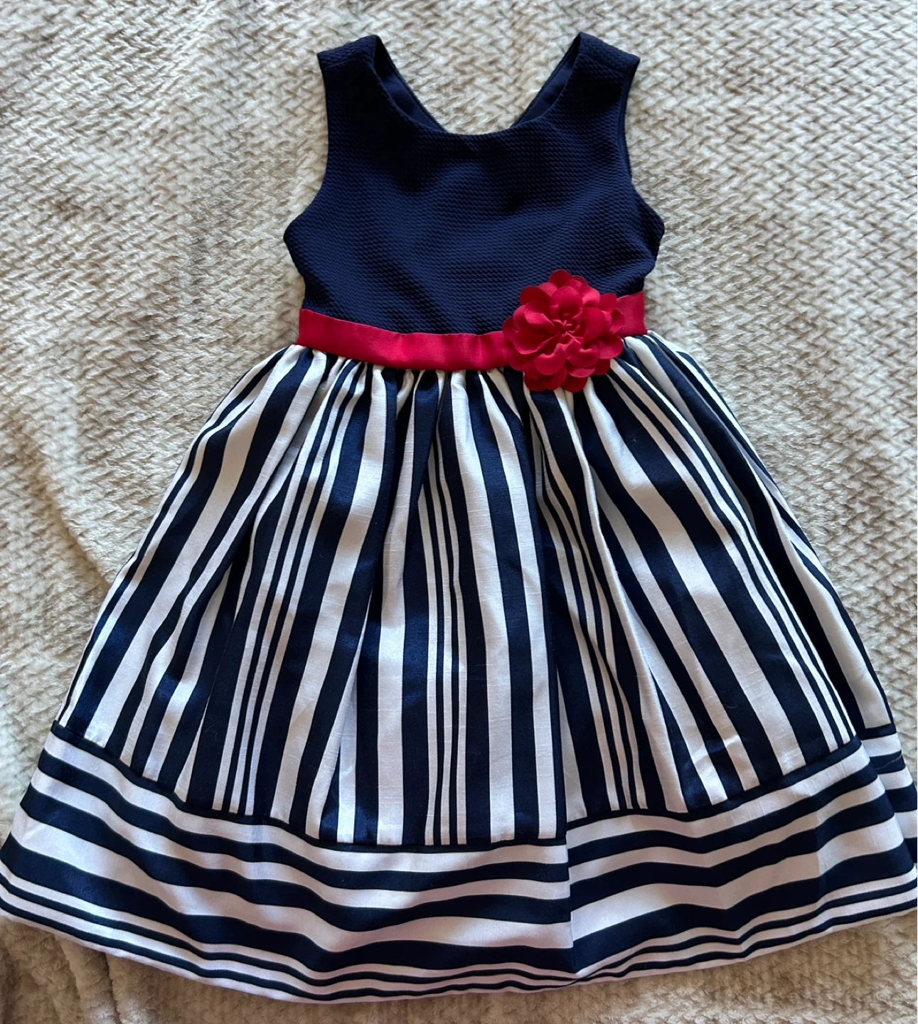 This adorable dress features a navy blue bodice and a striped skirt with navy and white stripes. It also has a cute red flower detail at the waist. Perfect for any occasion! Available in: Size 6 Size 8
