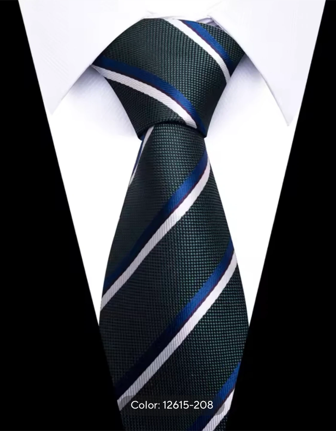 23A stylish necktie featuring a striped pattern in blue and white against a dark background. The color code is 12615-208, adding a touch of sophistication to any outfit