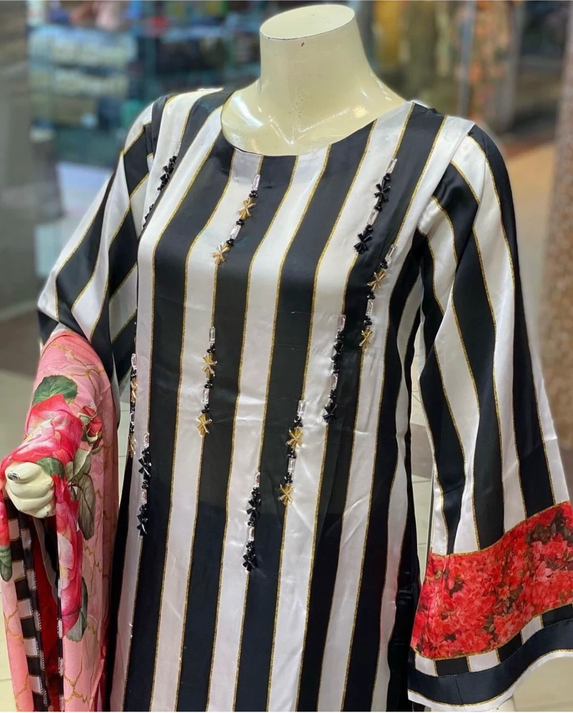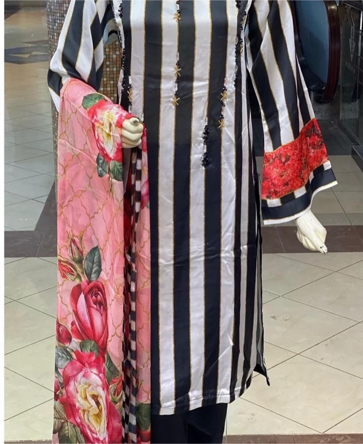 Beautiful salwar kameez silk suit with a striking black and white striped pattern. The fabric has a lovely sheen, and it comes with a matching dupatta featuring a floral design. Perfect for a special occasion or adding some flair to your wardrobe