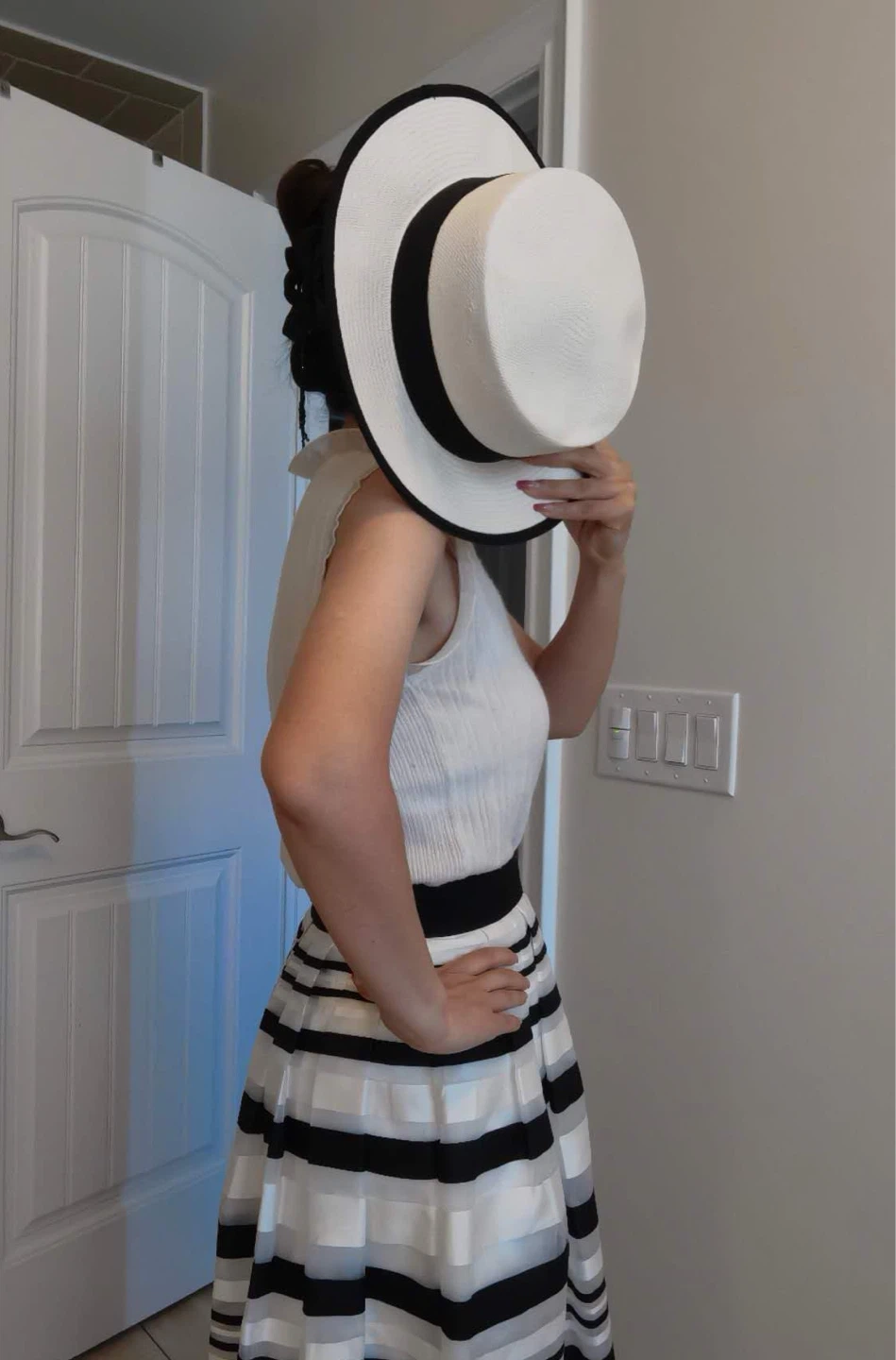 Selling a cute striped skirt in black, white, and grey! It's in great condition and perfect for summer. The skirt has a black waistband and a flowy feel. It would look great with a simple top!