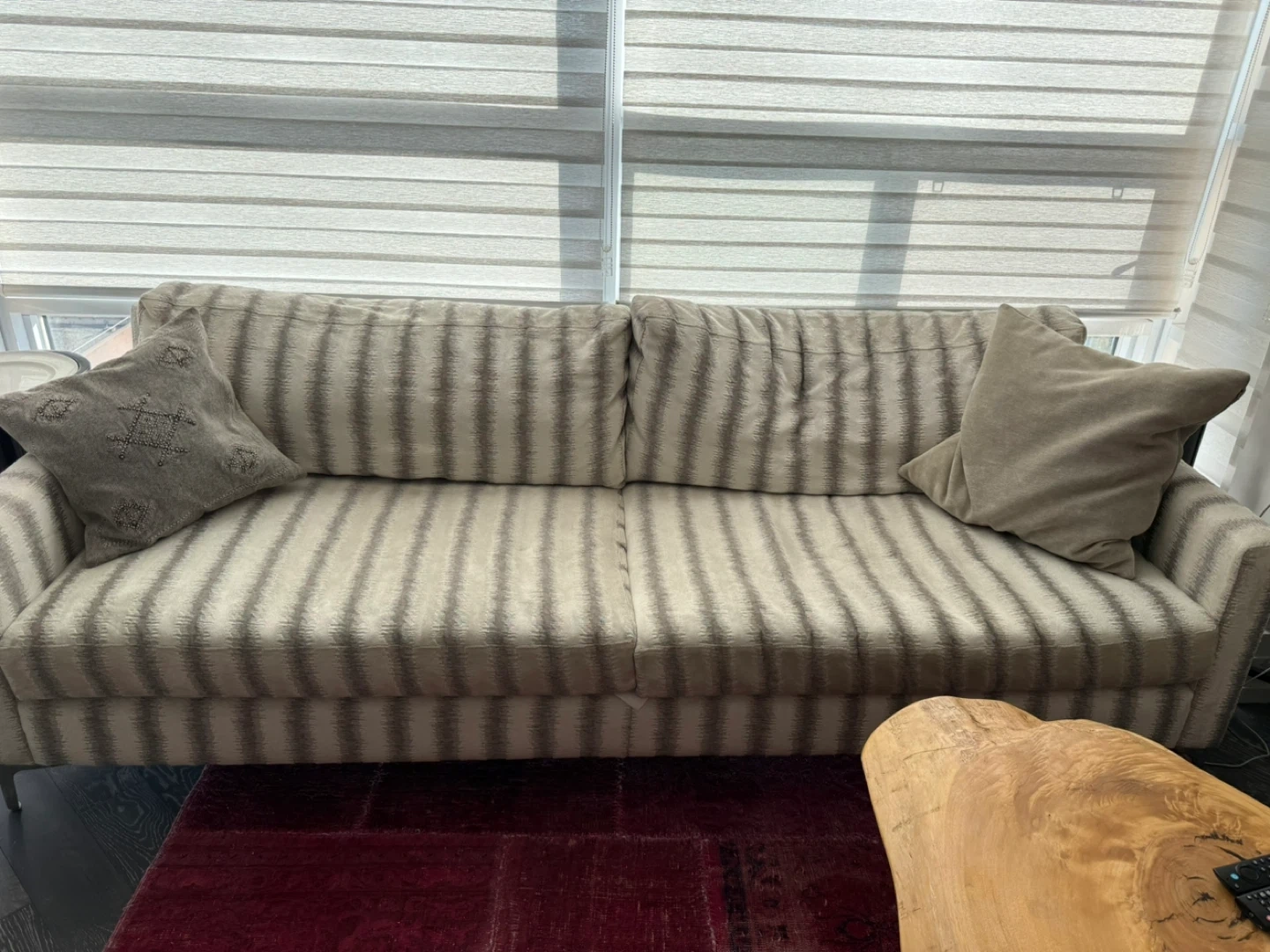 15Selling a comfy striped sofa that comes with two pillows. It's in great shape and would look lovely in any living room. The neutral stripes make it easy to match with your existing decor! Perfect for lounging and relaxing after a long day