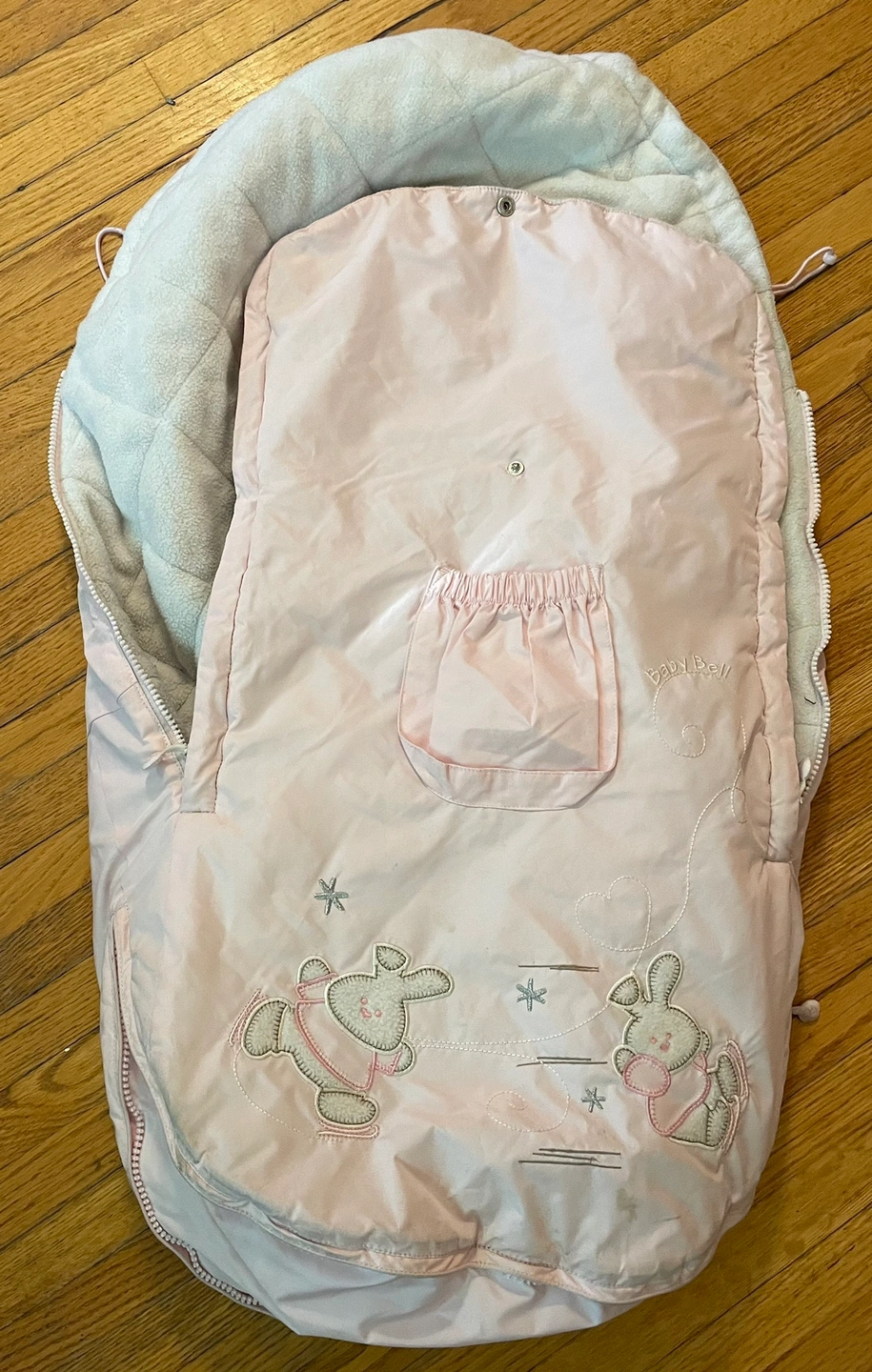 136Pink Baby stroller cozy with bunny design. It is warm and cozy for the fall and winters.