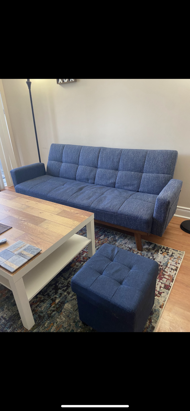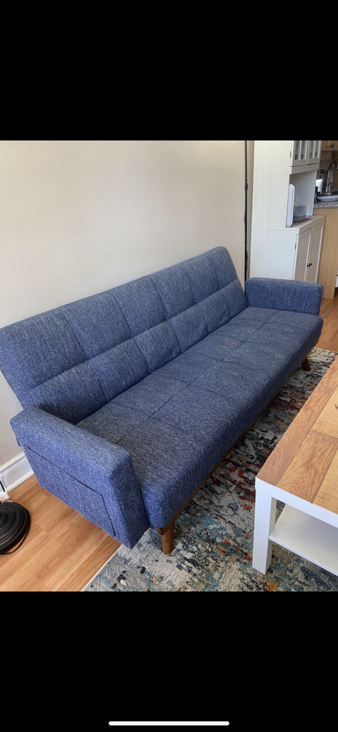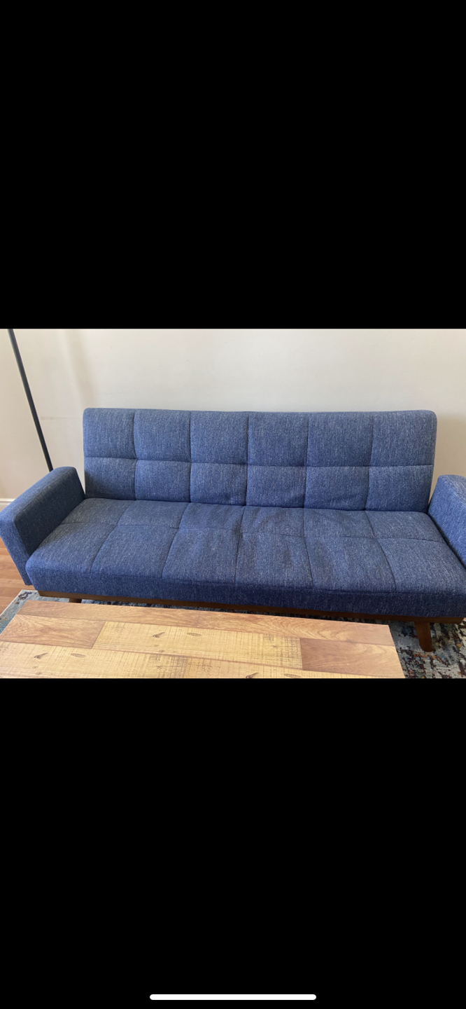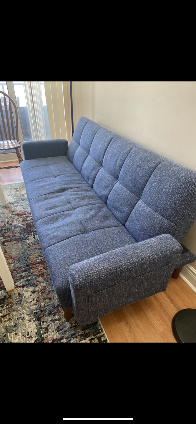 5Structube blue 3 seater sofa and reclines and becomes bed. Experience modern comfort and style with our Blue Sofa Bed. Its sleek design and versatile color effortlessly elevate any living space. Enjoy plush cushions by day and transform it into a cozy guest retreat by night. Upgrade your home today!