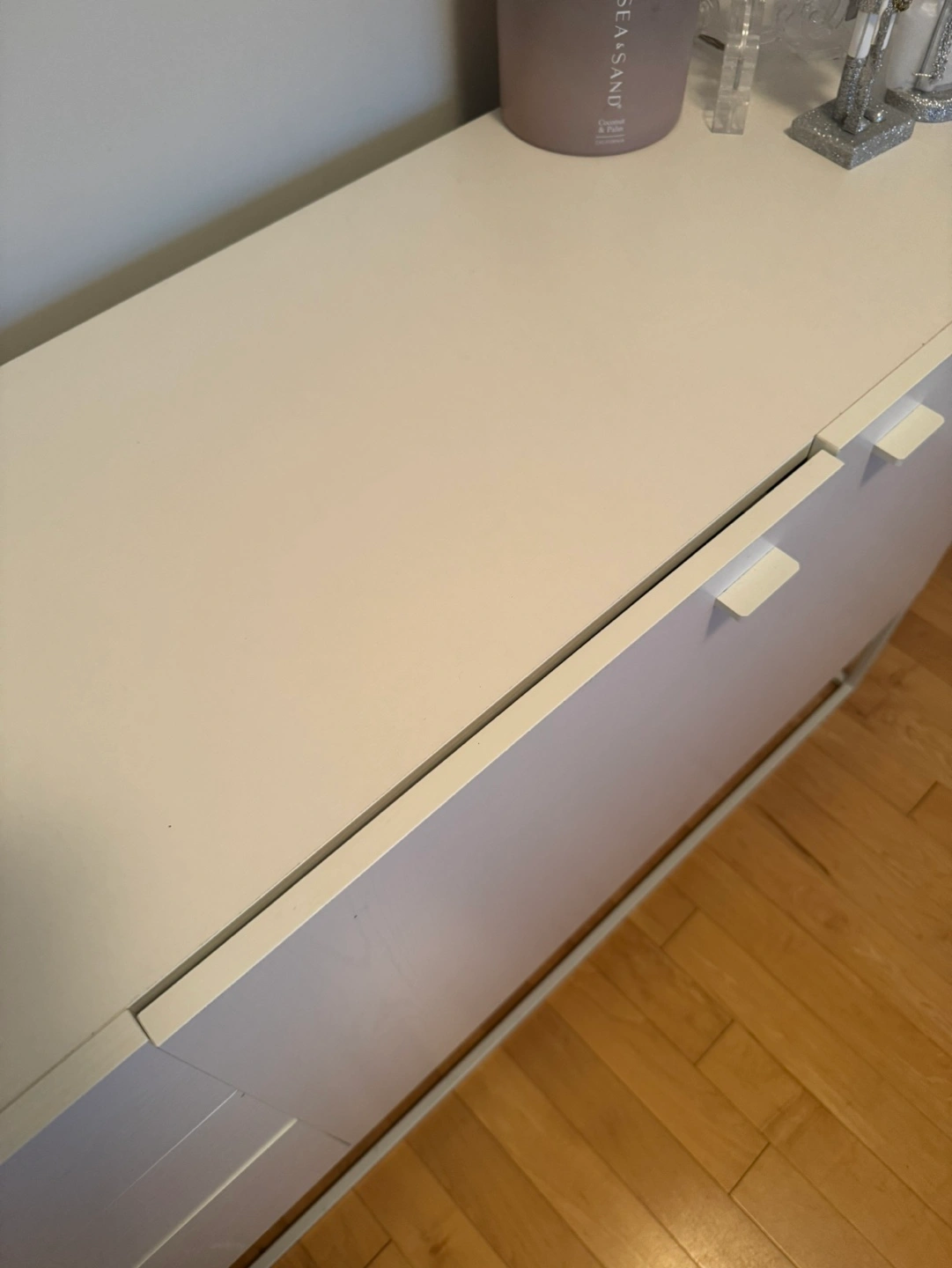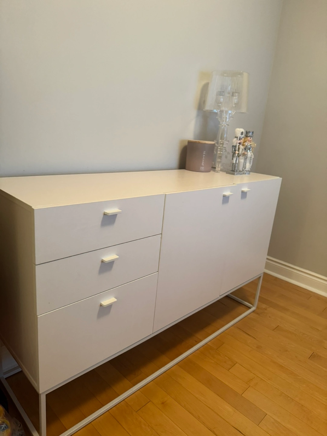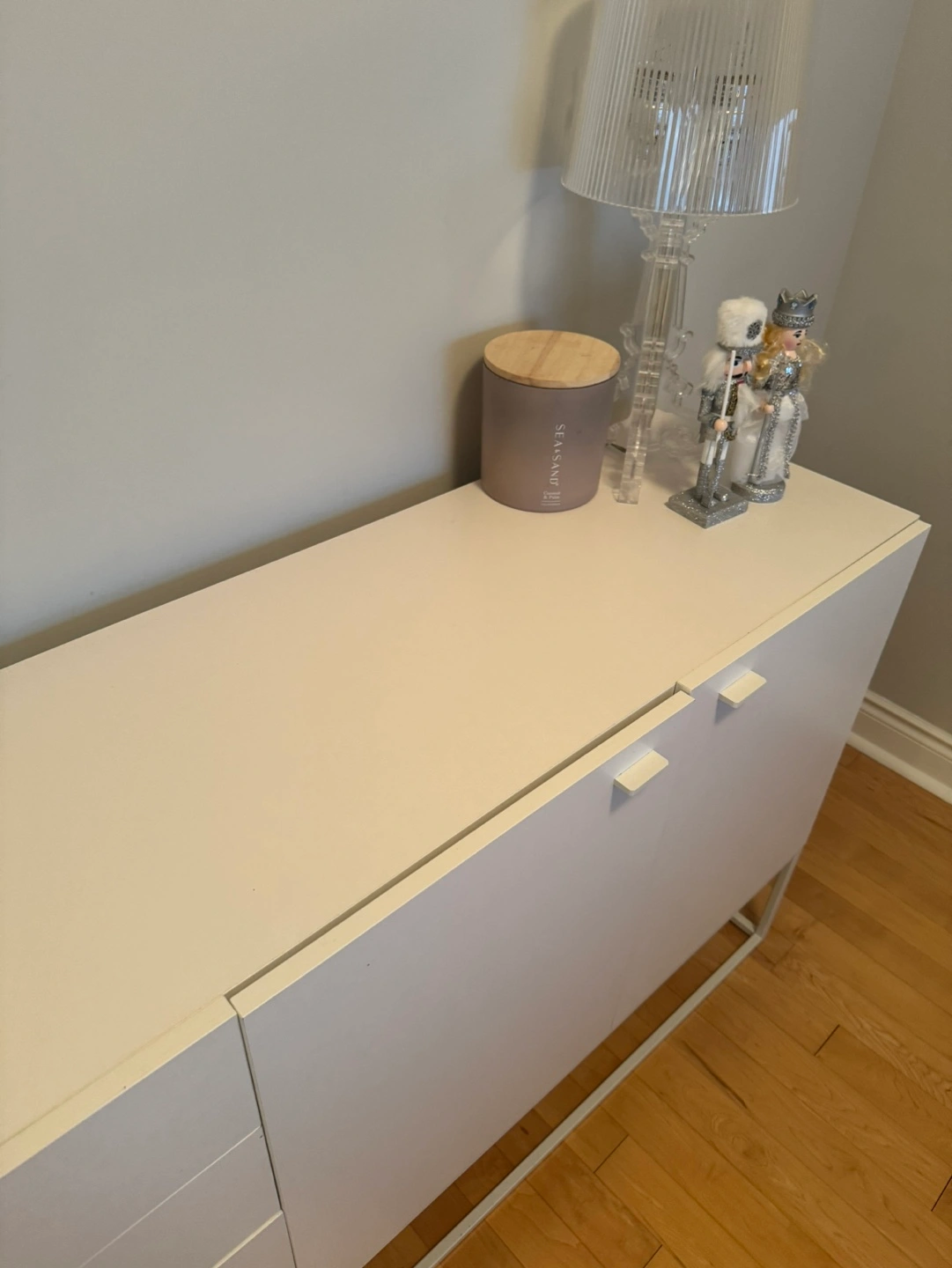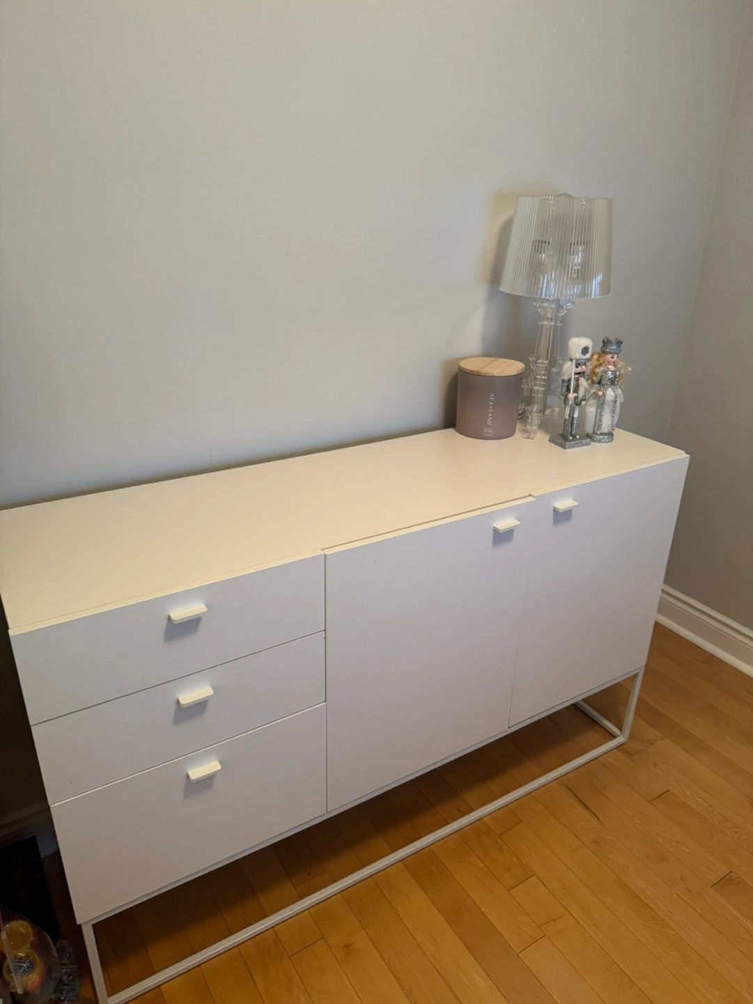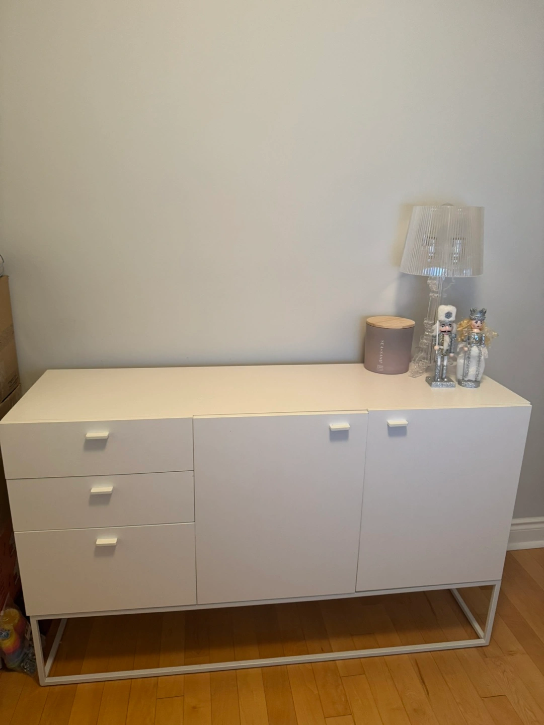 White sideboard with three drawers and two doors. Metal frame. Good condition. Will need to fix left door. Not broken, just need to align it again. Used for one year. Paid at structube for $258.77. $175 obo. Will need to pick up and bring own car/truck. 82cm x 136cm x 41cm