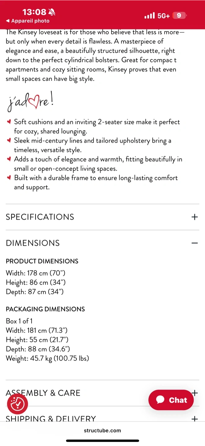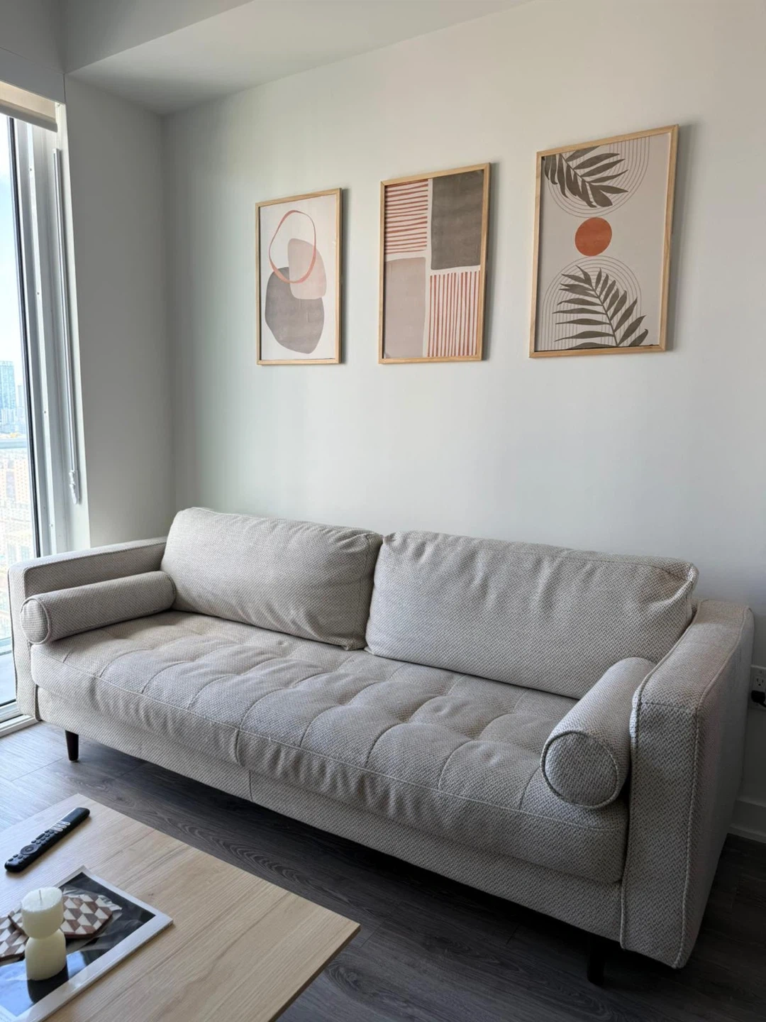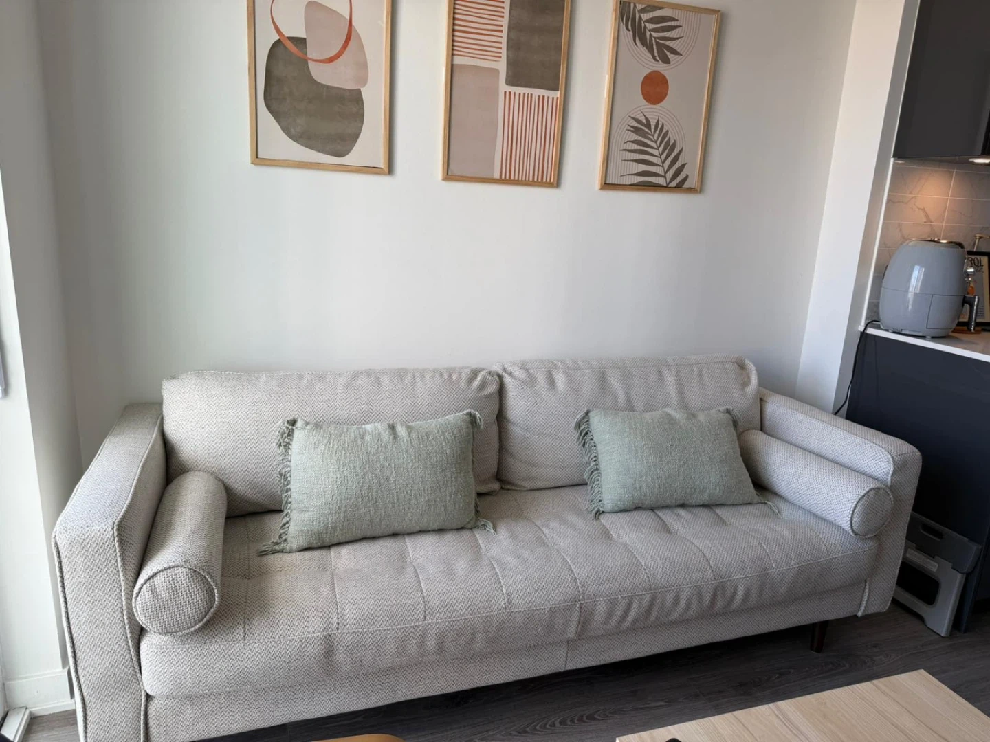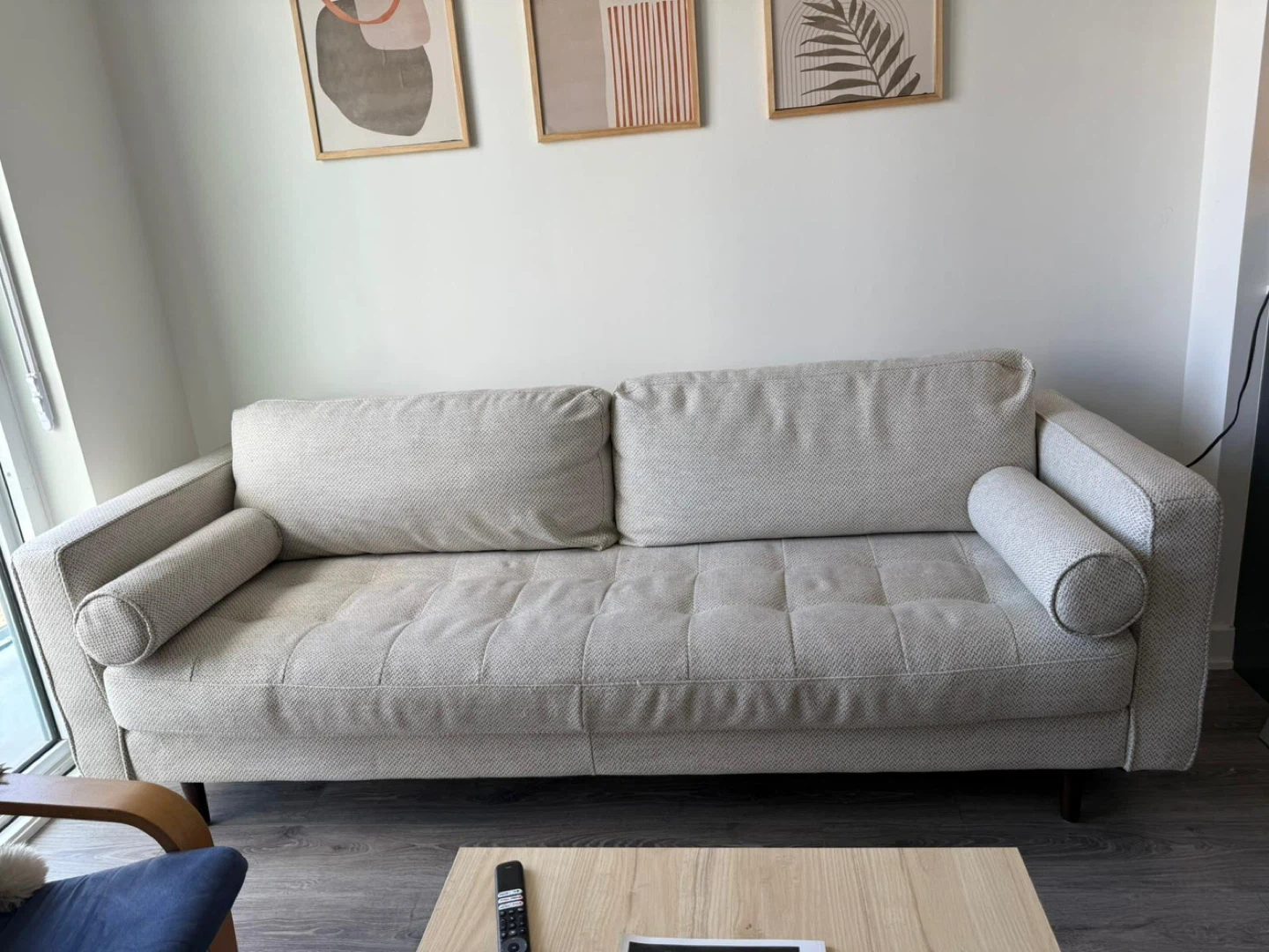 93Selling a Structube Kinsey loveseat in beige! It's in great condition and perfect for small spaces. The loveseat has soft cushions and a sleek mid-century style. The dimensions are 178 cm (70") wide, 86 cm (34") high, and 87 cm (34") deep