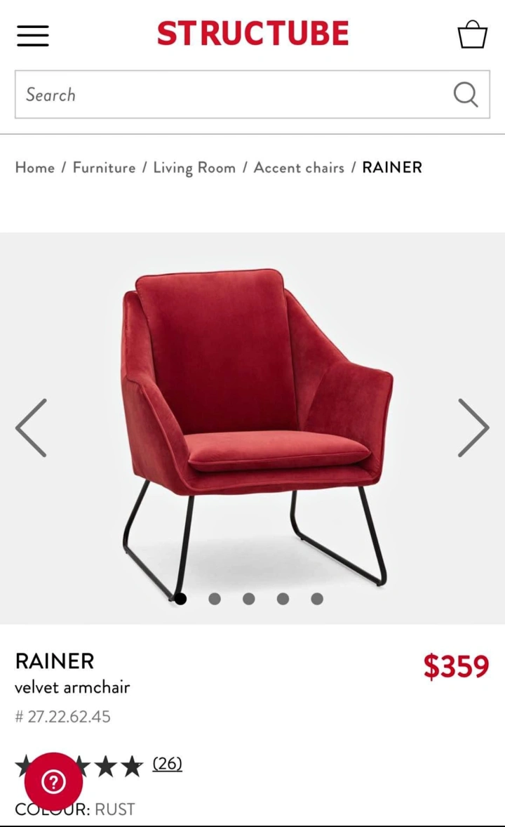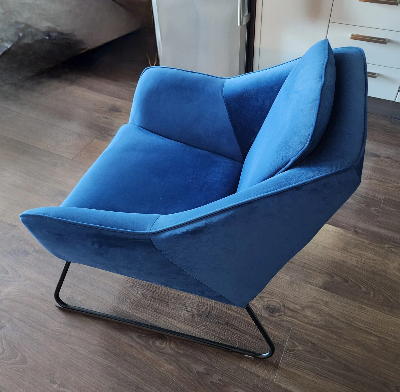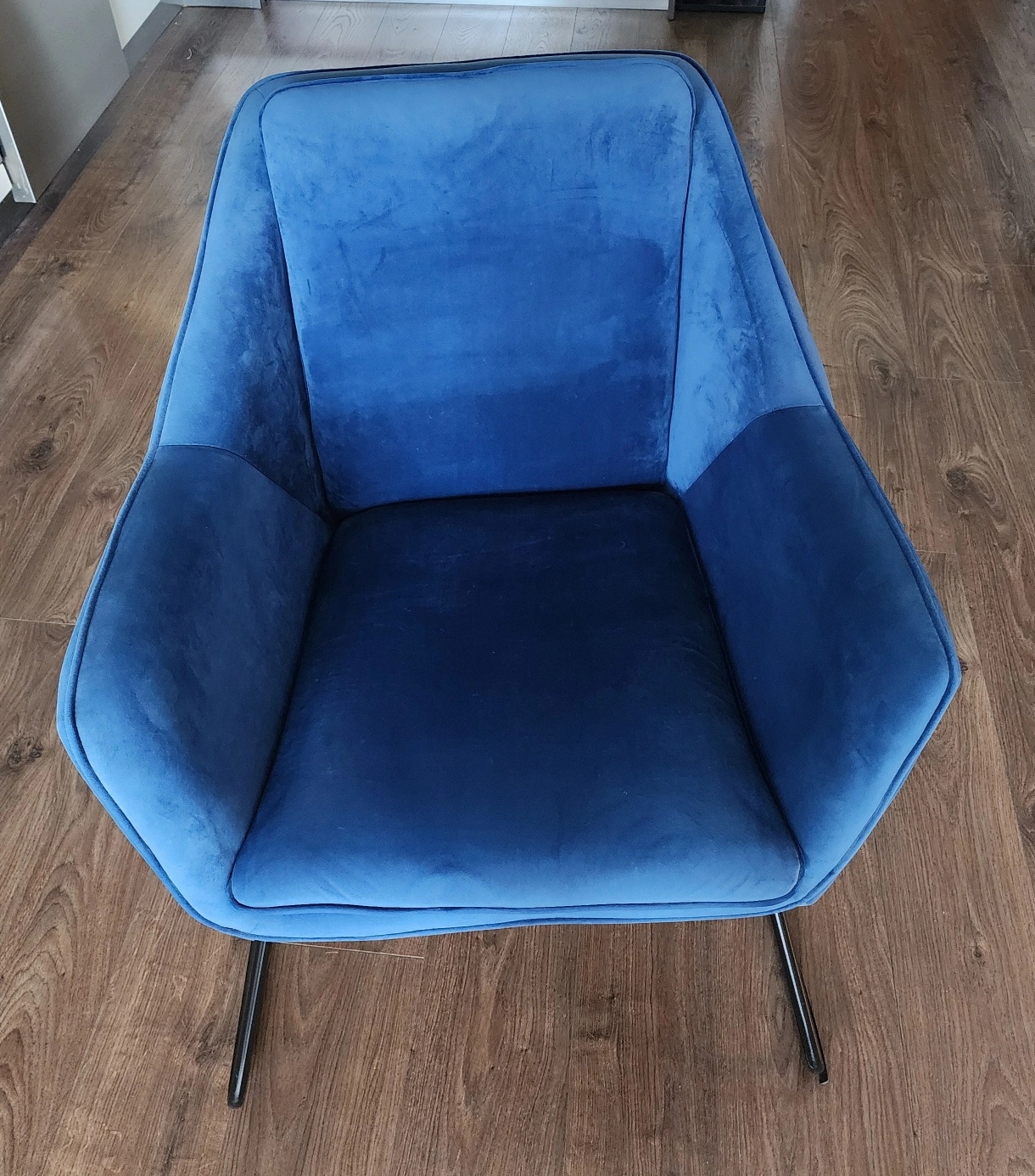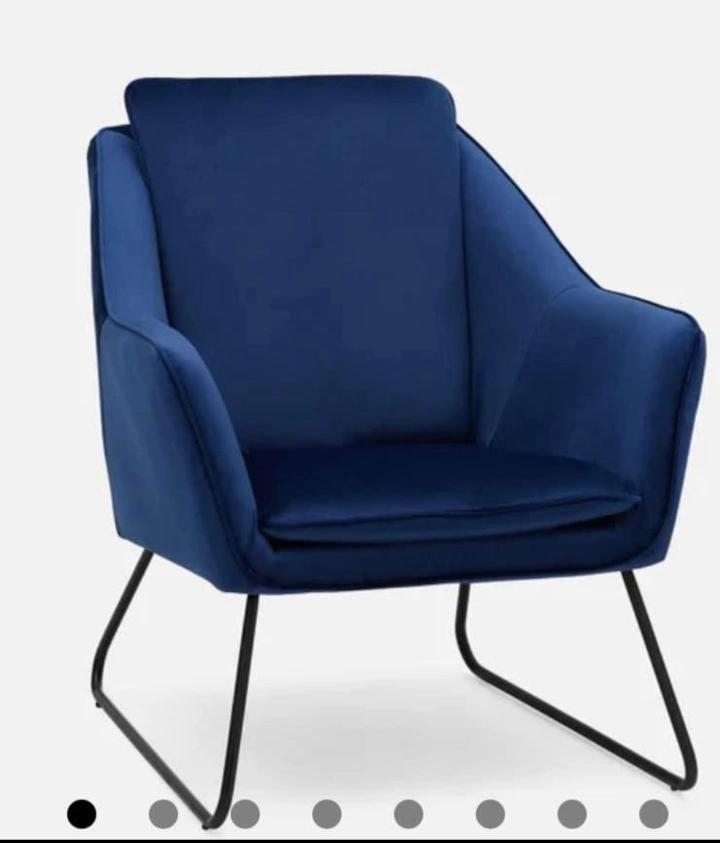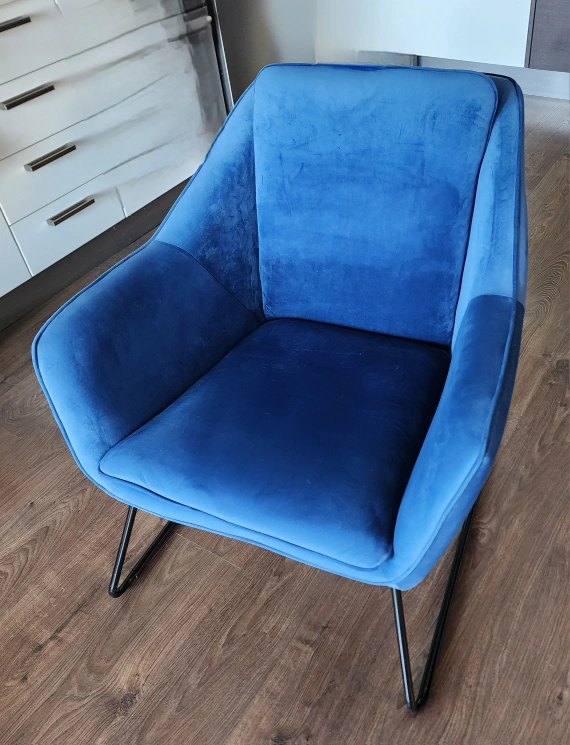 **Love these chairs! Only selling them as I don't have the space anymore :( ** Structube Rainer Armchairs in Dark Blue. In great condition. Original price - $359+ tax. Avant-garde, ultra-modern lounge chair. The sculptural, body-hugging chair offers comfortable seating and a padded back in velvet upholstery. This accent chair is a unique, iconic piece, with contemporary lines, that rests on sturdy angled metal legs. Cover material: 100% polyester Back cushions are integrated. Seat cushions are integrated Legs: metal PRODUCT DIMENSIONS Width: 77 cm (30") Height: 85 cm (33") Depth: 83 cm (33")