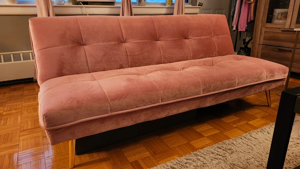 60Selling a lovely pink velvet futon sofa bed. It's in great condition and would be a stylish addition to any living space. The velvet material gives it a soft and luxurious feel! It was used as a decorative piece, so it's like new. Structube description: The effortlessly stylish Sean velvet sofa-bed brings conventionality to any modern home. With an easy-to-use space-saving design that stands on beautiful angular legs, your guests will be impressed. Filling: 90% polyurethane foam, 10% polyester fibres Back and seat cushions cover: 100% polyester Painted iron legs Cushion padding density: 50kg/m3 Frame: 85% eucalyptus wood and 15% plywood | Structube Sean Tufted Velvet Sofa Bed 77cm x 180cm x 88cm in Pink
