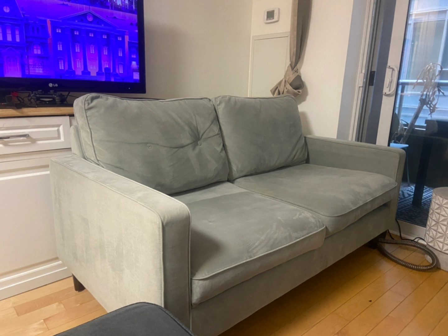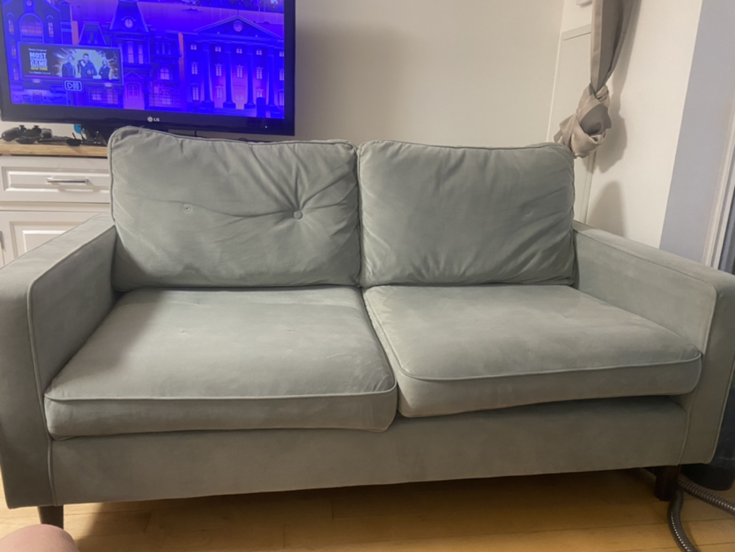23Roughly 3 year old teal velvet love seat from Structube. Super comfortable with deep seating. Missing buttons on back pillows (fair/good condition because of that factor) Recently cleaned with Boswell Little green carpet cleaner $250 o.b.o Dimensions: 64” L x 30.5” H x 33” W