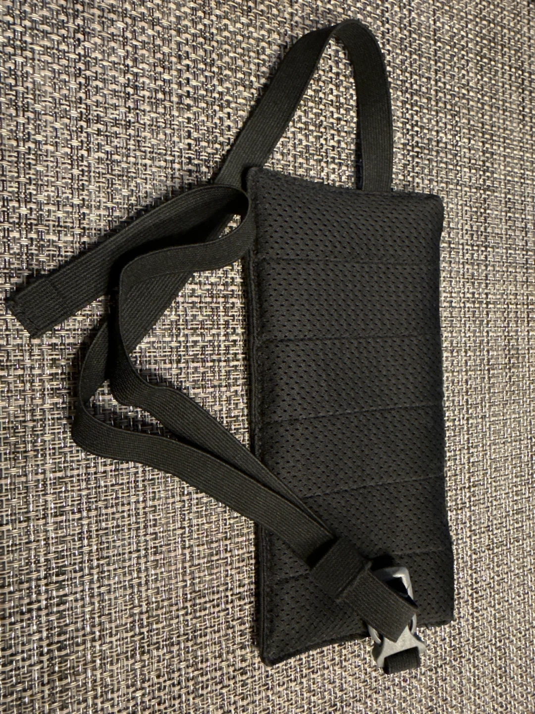 This MEC travel pouch is black and has a zippered main compartment and an adjustable elastic strap. It's made of durable fabric for carrying essentials on the go. Perfect for keeping your passport and money secure during trips!