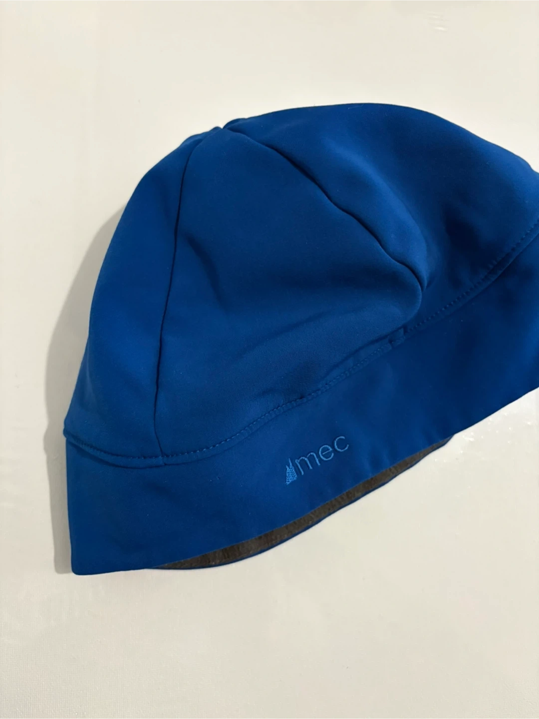 This MEC beanie is a vibrant blue and features a soft fleece lining for added warmth. It's designed for comfort during cooler weather activities. Keeps your head toasty!