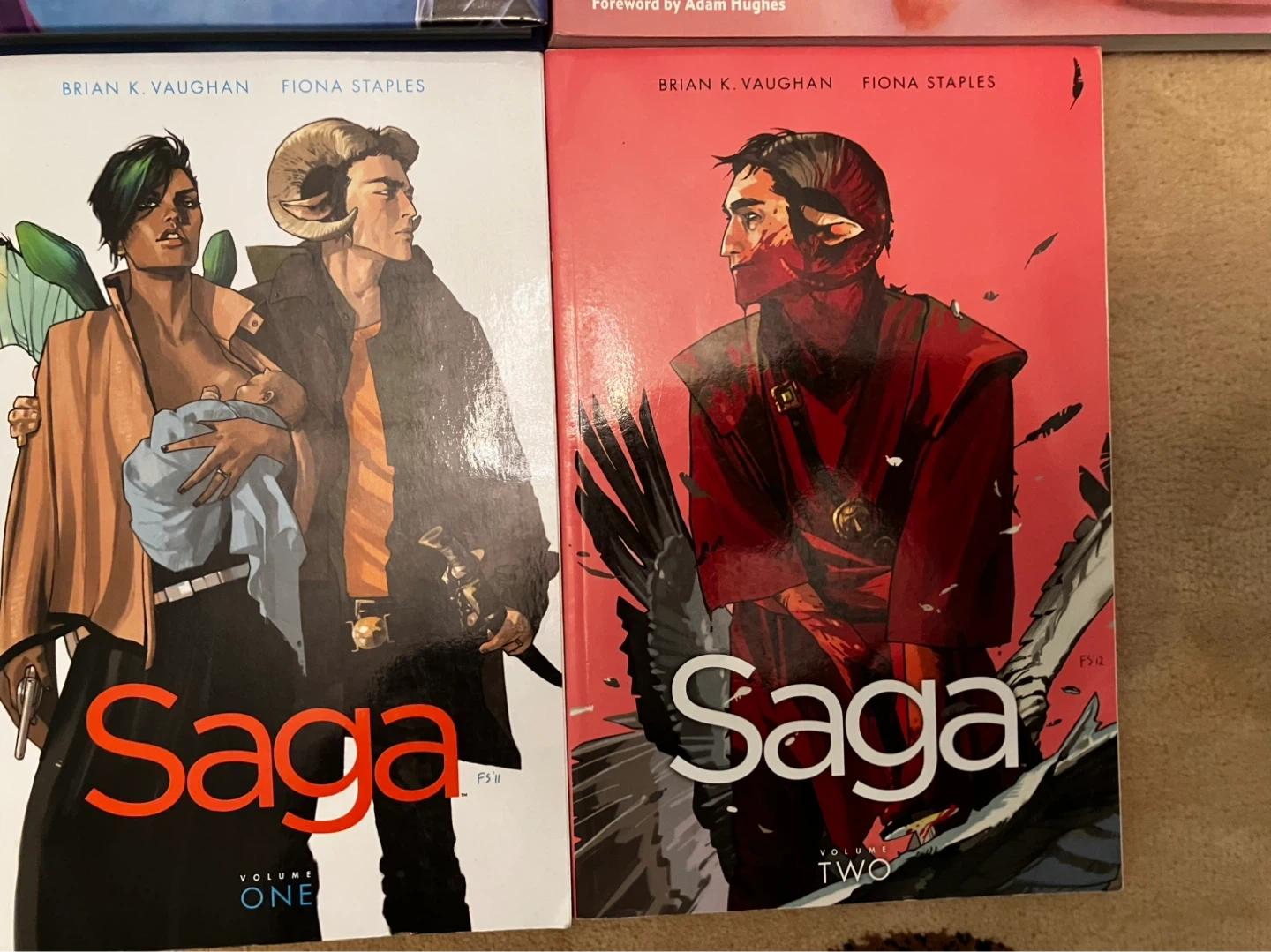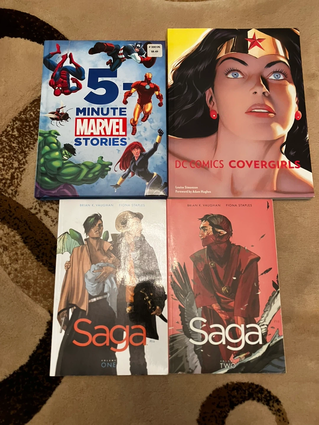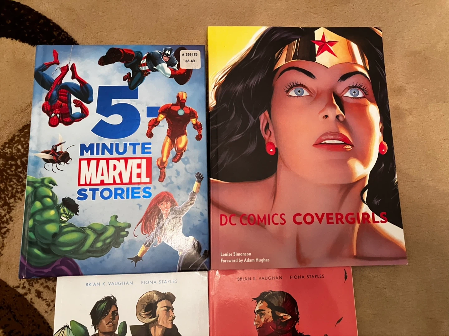 Bundle includes '5 Minute Marvel Stories' and 'DC Comics Covergirls'. Also includes 'Saga Volume One' and 'Saga Volume Two' graphic novels. These books are great for any comic fan!