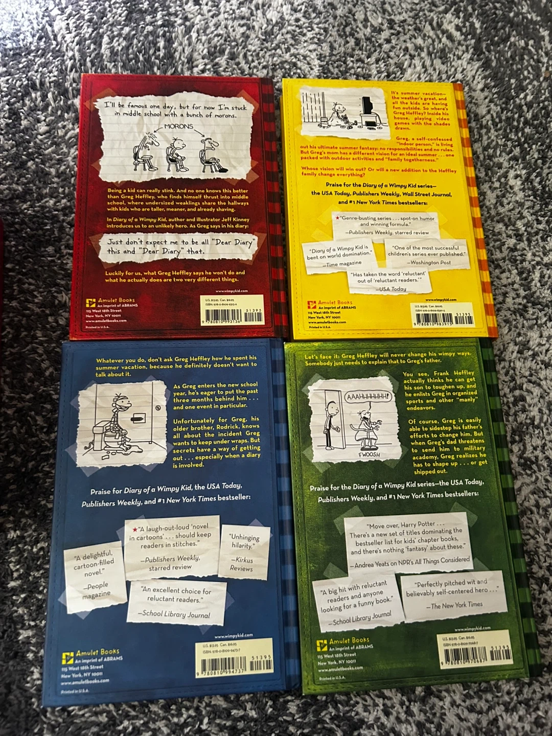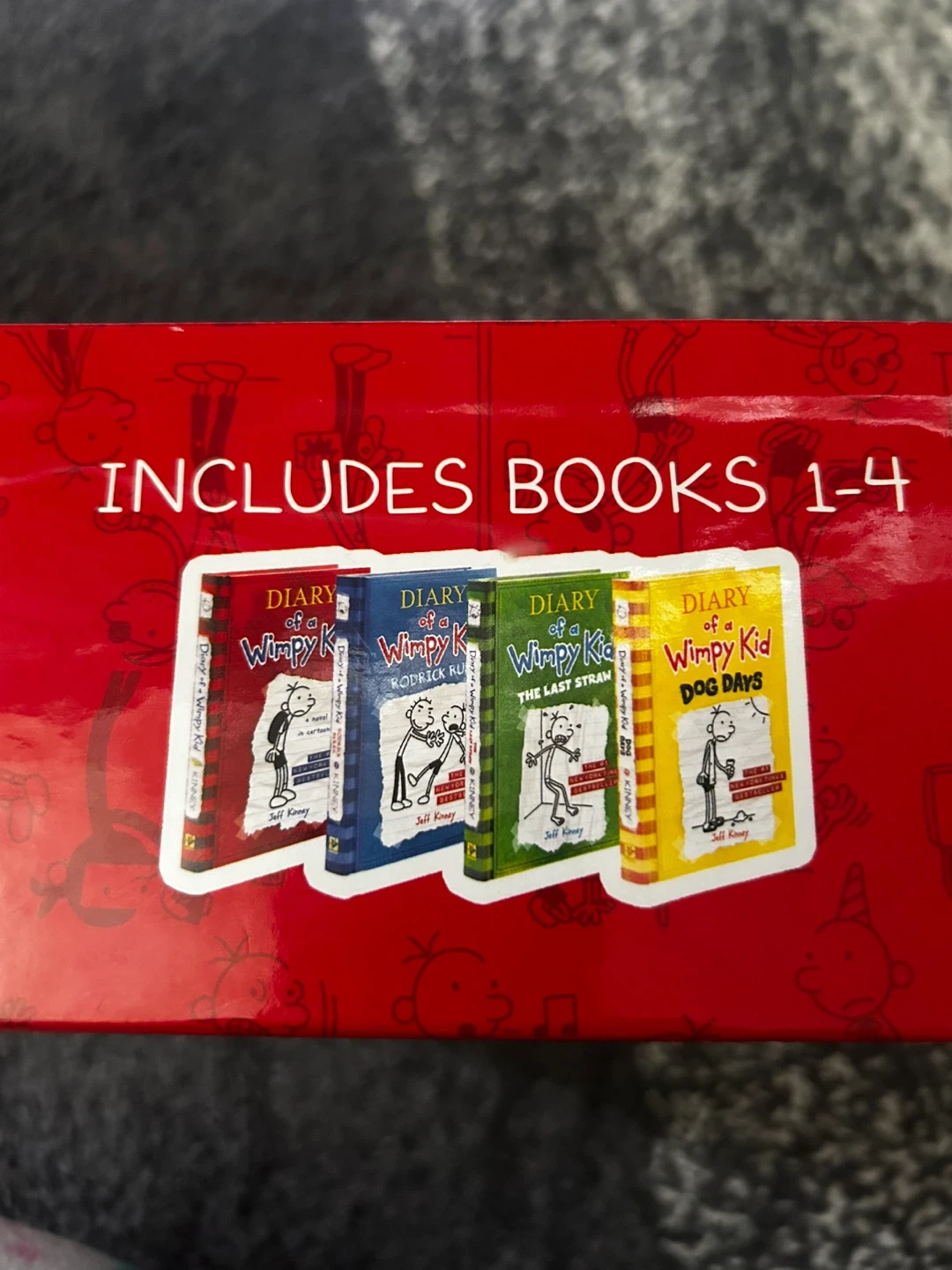 This set includes books 1-4 of the Diary of a Wimpy Kid series by Jeff Kinney. It contains 'Diary of a Wimpy Kid', 'Rodrick Rules', 'The Last Straw', and 'Dog Days'. These are popular novels for young readers.