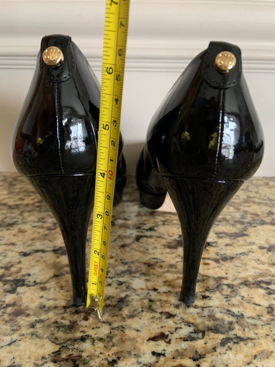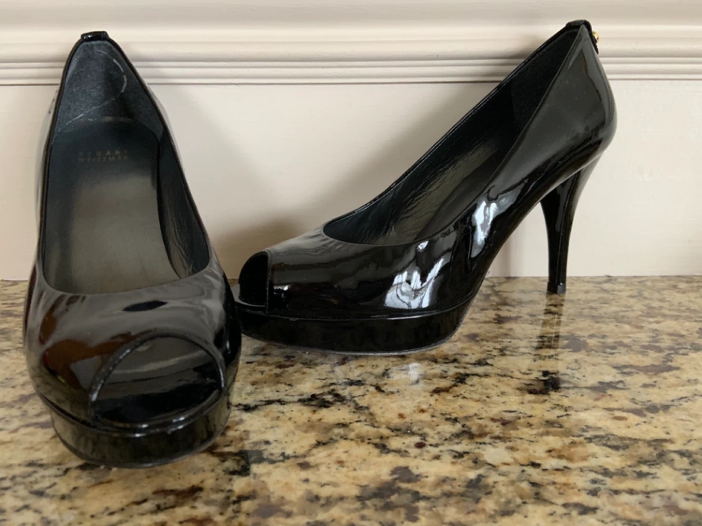 10These Stuart Weitzman heels are a stylish addition to any wardrobe! They feature a sleek black patent leather finish. The heel height is approximately 4.5 inches. Perfect for dressing up any outfit!